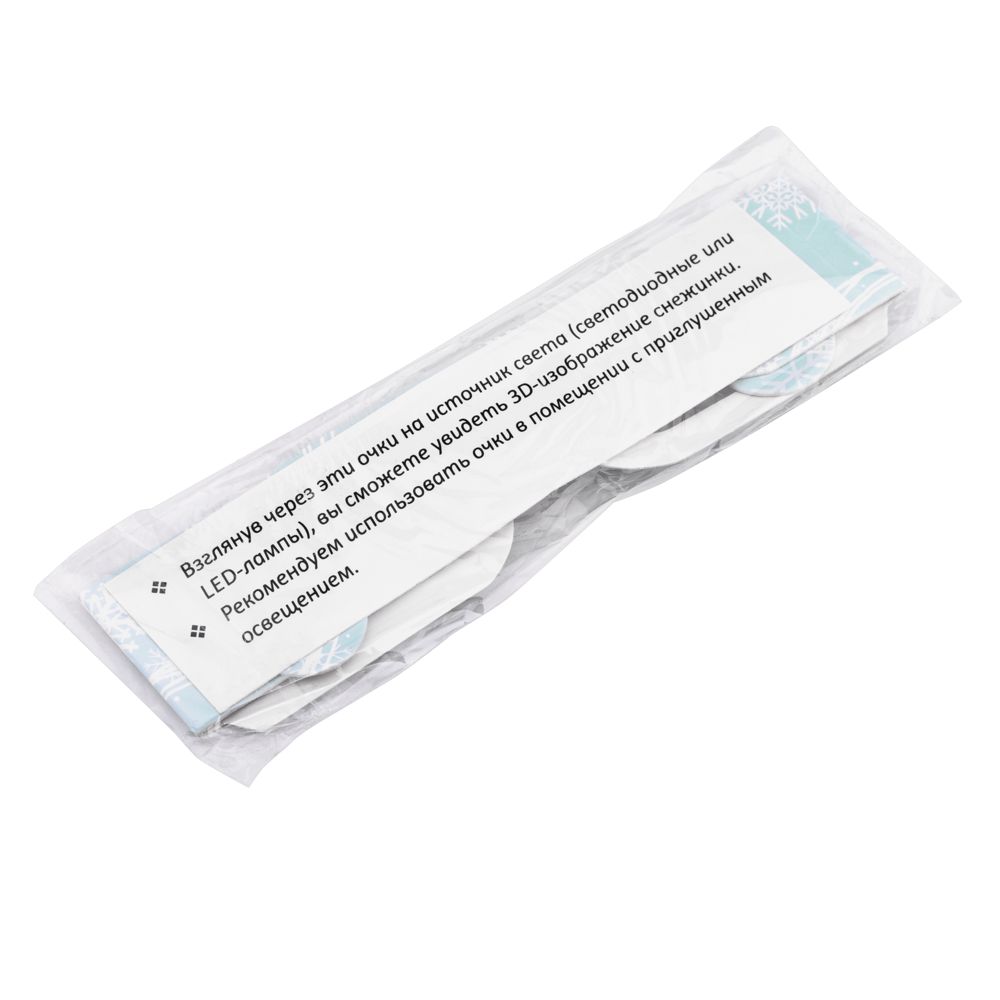 Взглянув через эти очки на источник света (светодиодные или LED-лампы), вы сможете увидеть 3D-изображение снежинки. Рекомендуем использовать очки в помещении с приглушенным освещением.
