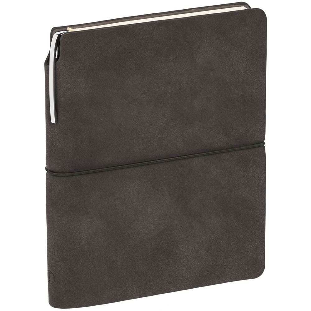 Ежедневник из искусственного материала, напоминающего замшу, и ручка с покрытием софт-тач, которая удобно прячется за обложку ежедневника.