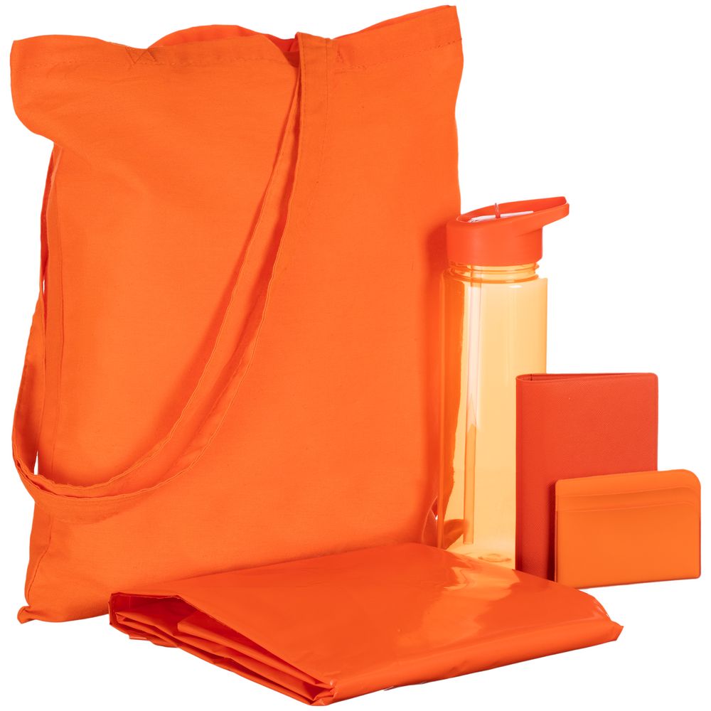 Большая спортивная бутылка для поддержания водного баланса, стильные личные аксессуары на каждый день и конечно, необходимый атрибут выездных мероприятий — плотный пластиковый дождевик-плащ с капюшоном. Все это собрано в идеальной упаковке — базовом тонком шопере, который может пригодиться на мастер-классе по рисованию на ткани.