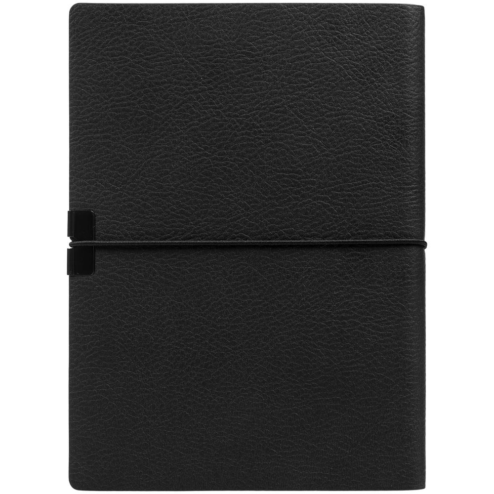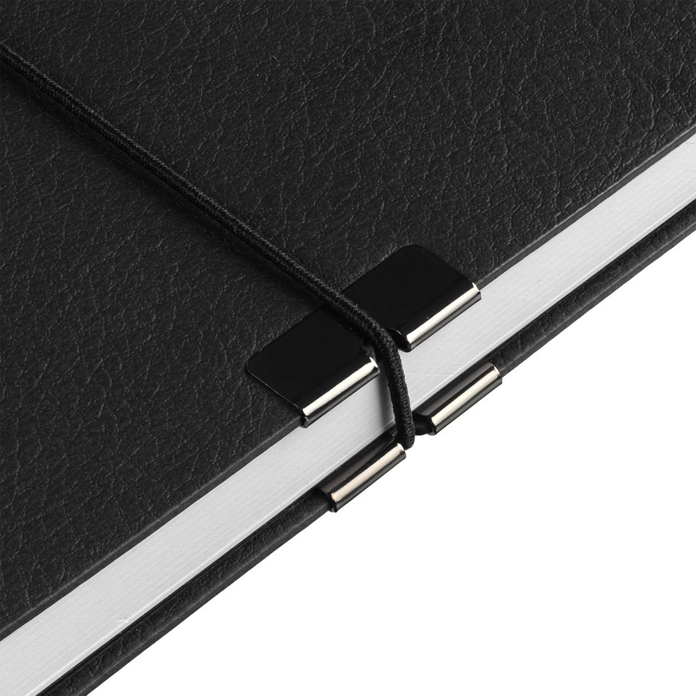 Закрывается на резинку, края блокнота защищены от сминания металлической накладкой.