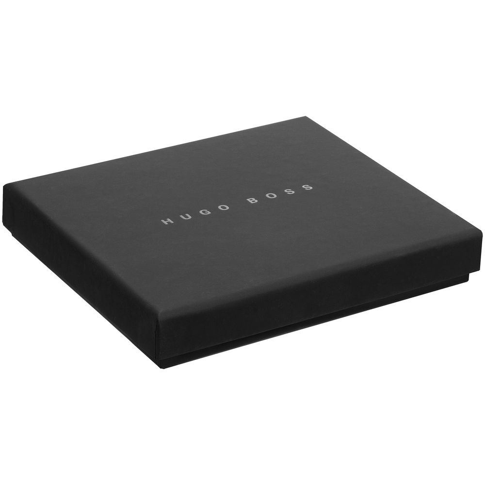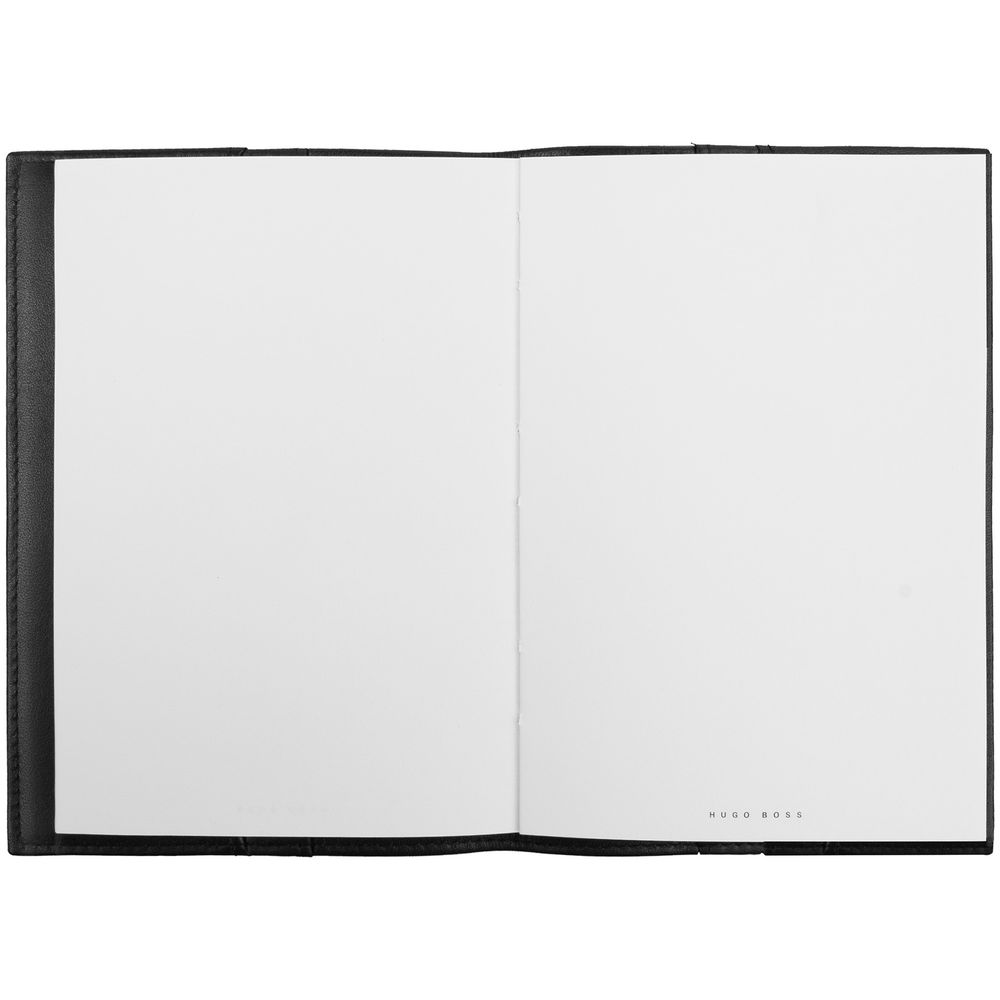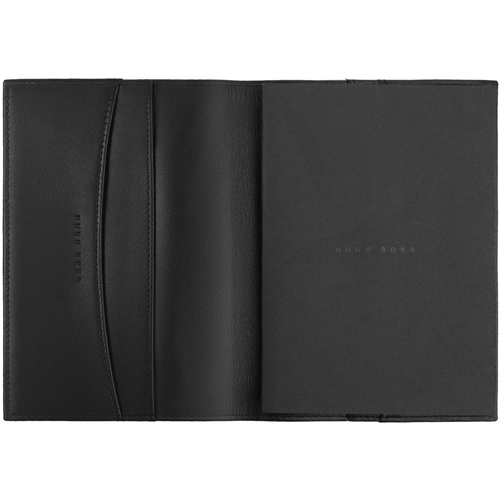 Блокнот формата А6 в съемной обложке из мягкой кожи. Пустой блок с логотипом Hugo Boss внизу страниц. Внутри обложки два кармана для заметок и записок.