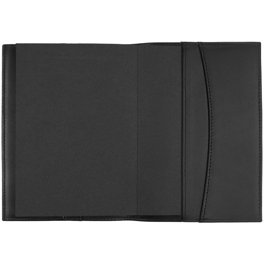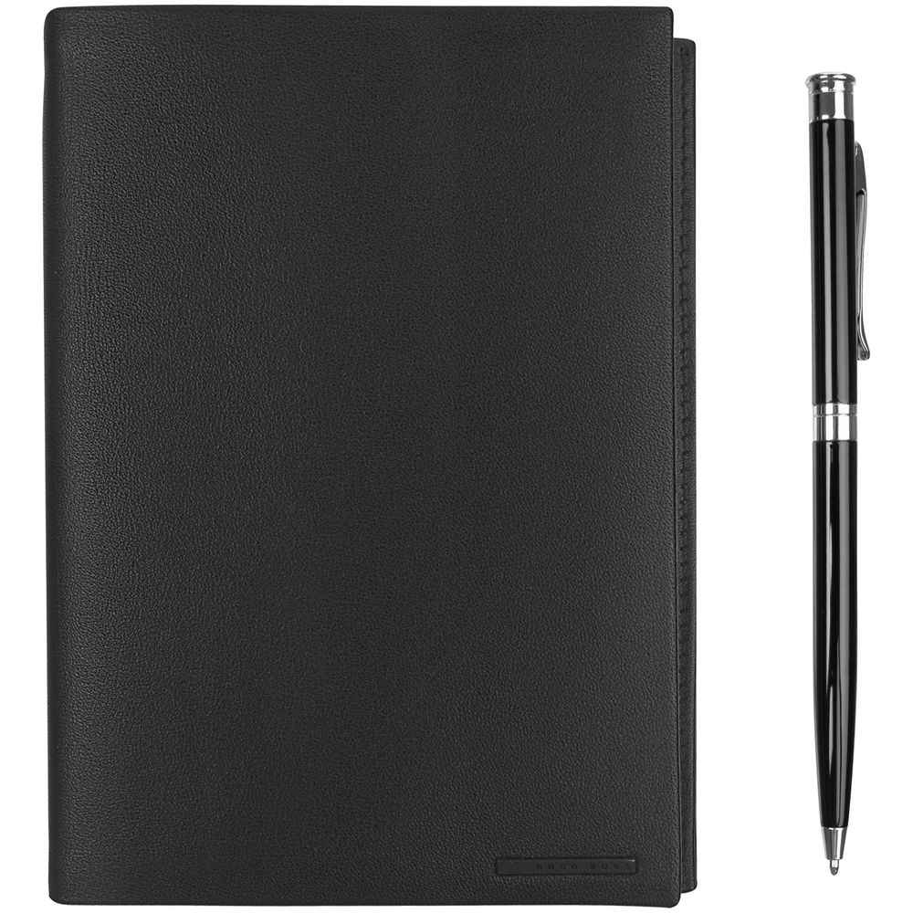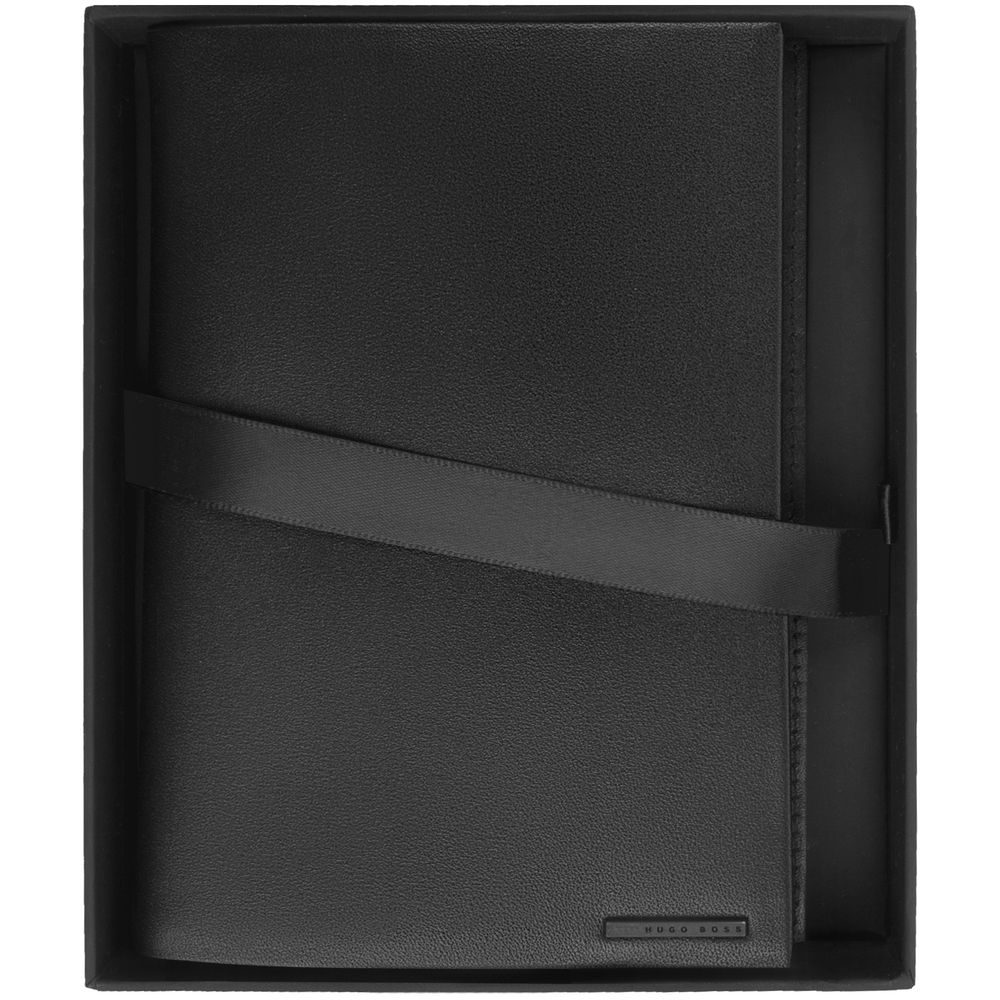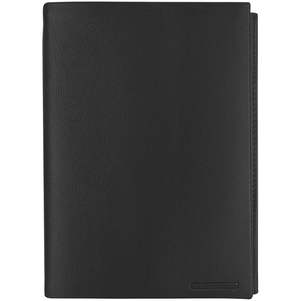 Блокнот формата А6 в съемной обложке из мягкой кожи. Пустой блок с логотипом Hugo Boss внизу страниц. Внутри обложки два кармана для заметок и записок.