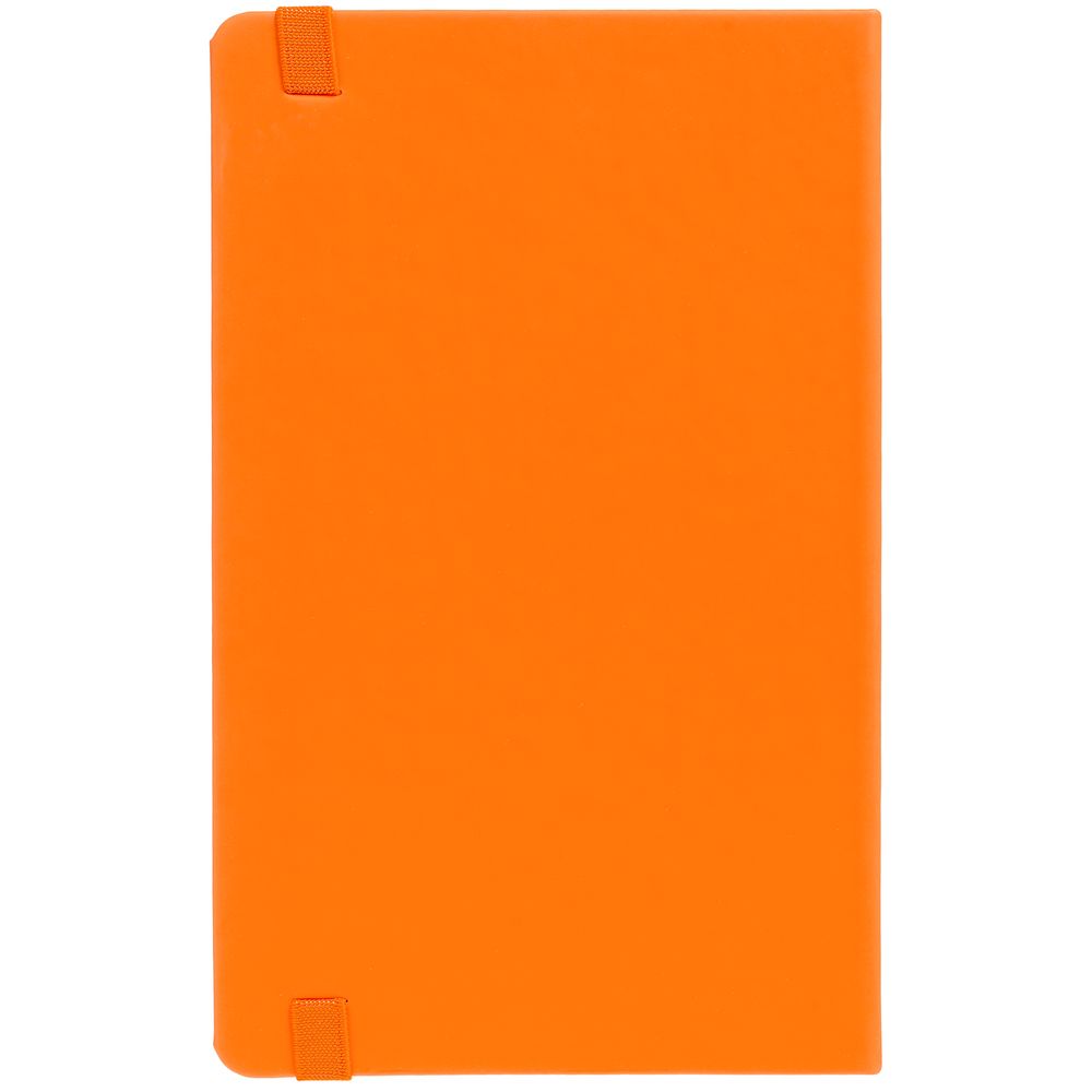 Блокнот в твердой обложке, выполнен из материала Soft Touch, оранжевый ОО, дополнен резинкой и ляссе в цвет обложки.