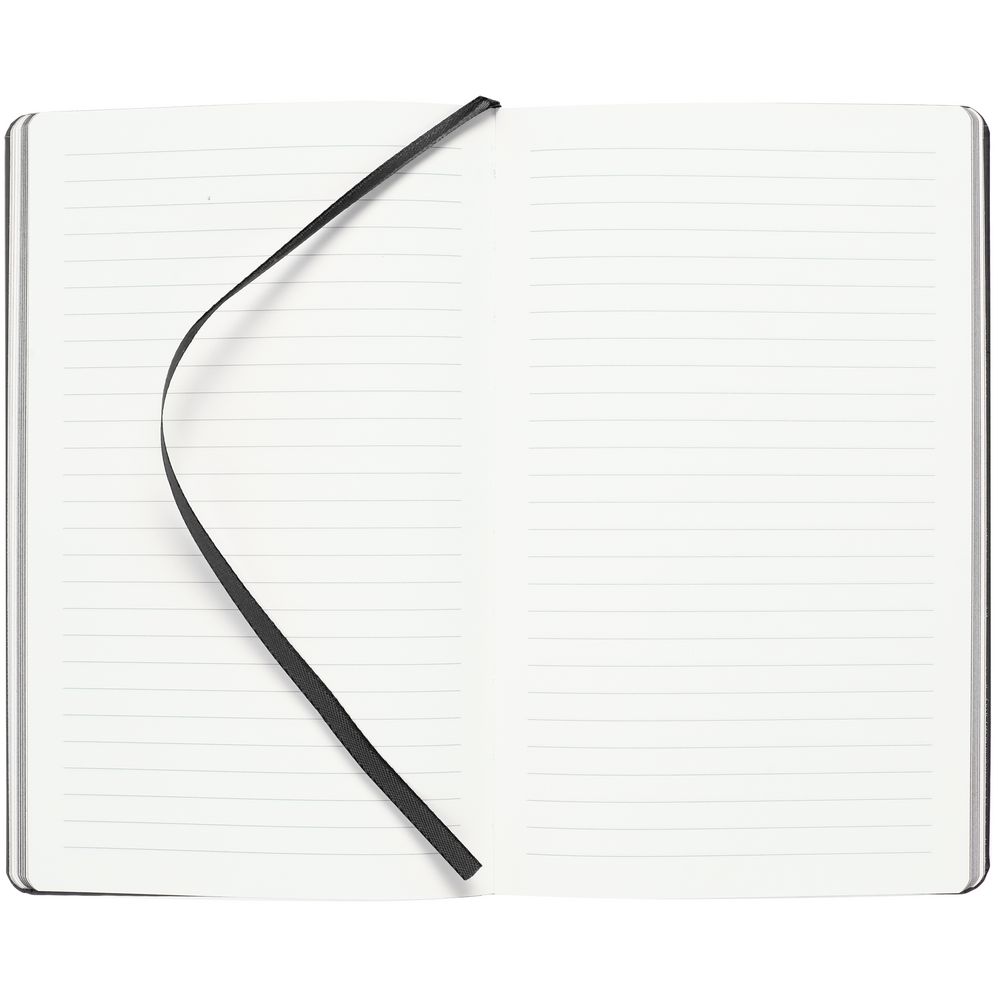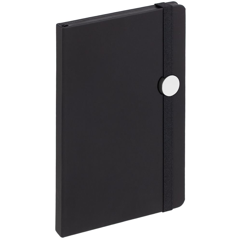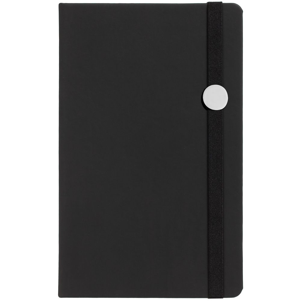 Блокнот в твердой обложке, выполнен из материала Soft Touch, черный АА, дополнен резинкой и ляссе в цвет обложки.