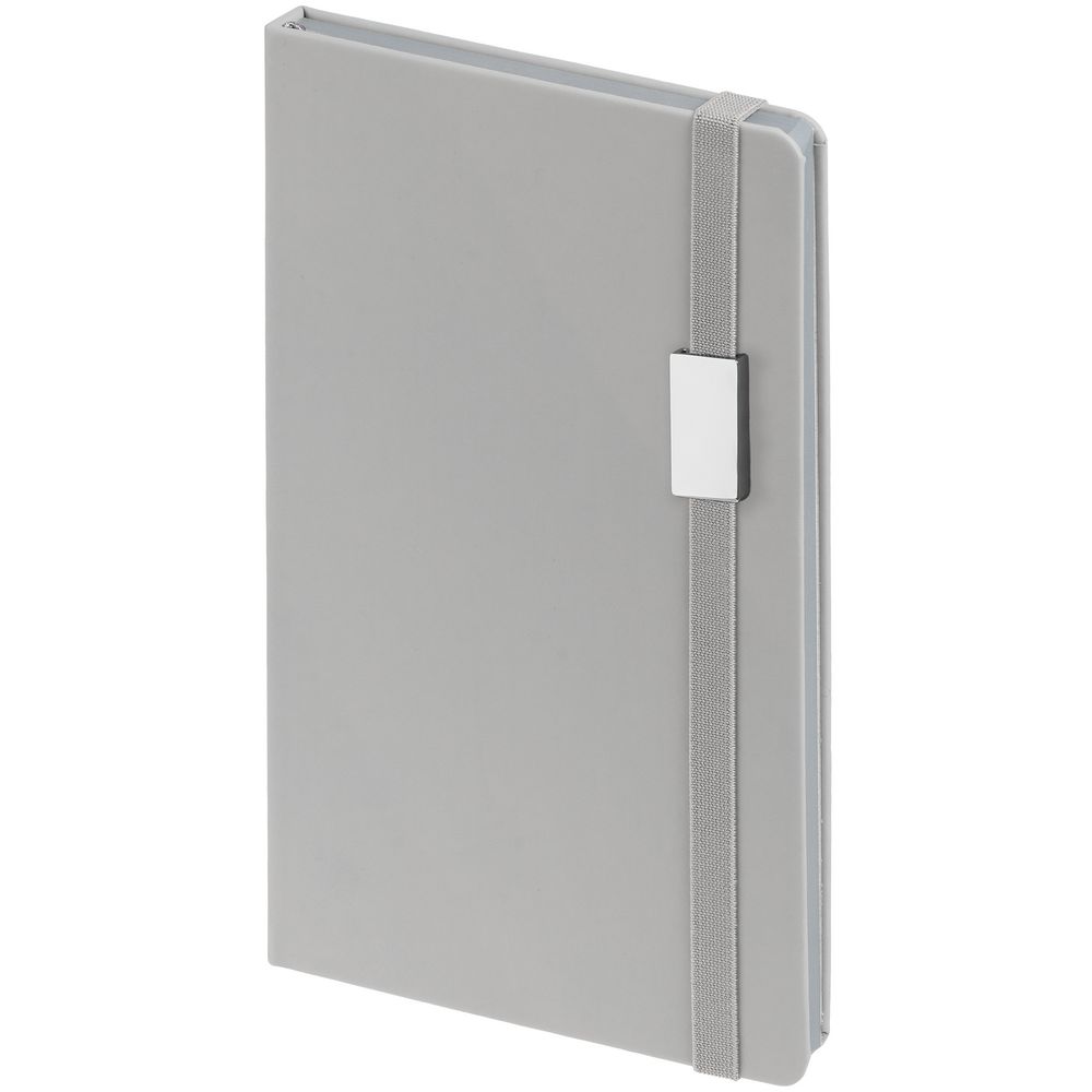 Блокнот в твердой обложке, выполнен из материала Soft Touch, серый СС, дополнен резинкой и ляссе в цвет обложки.