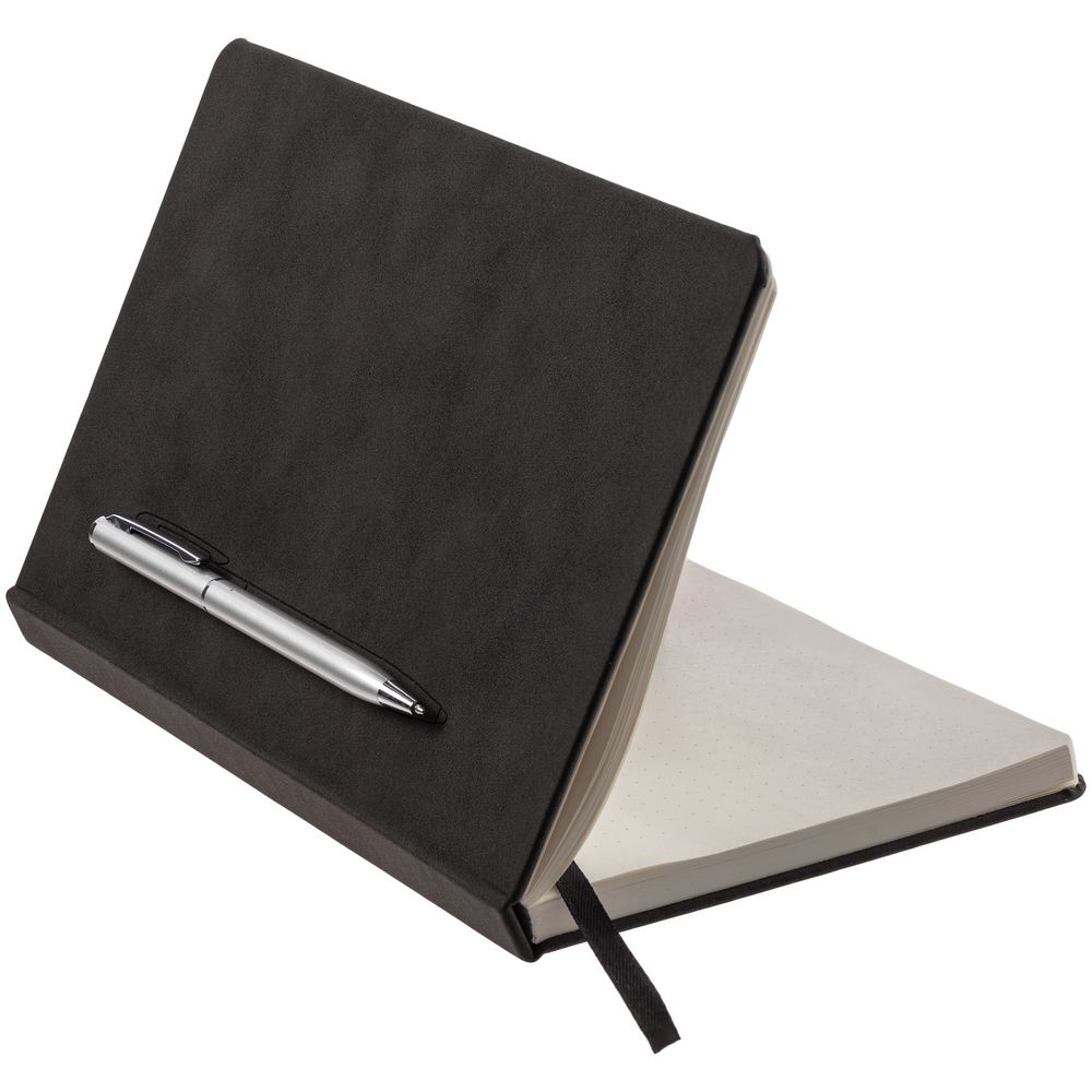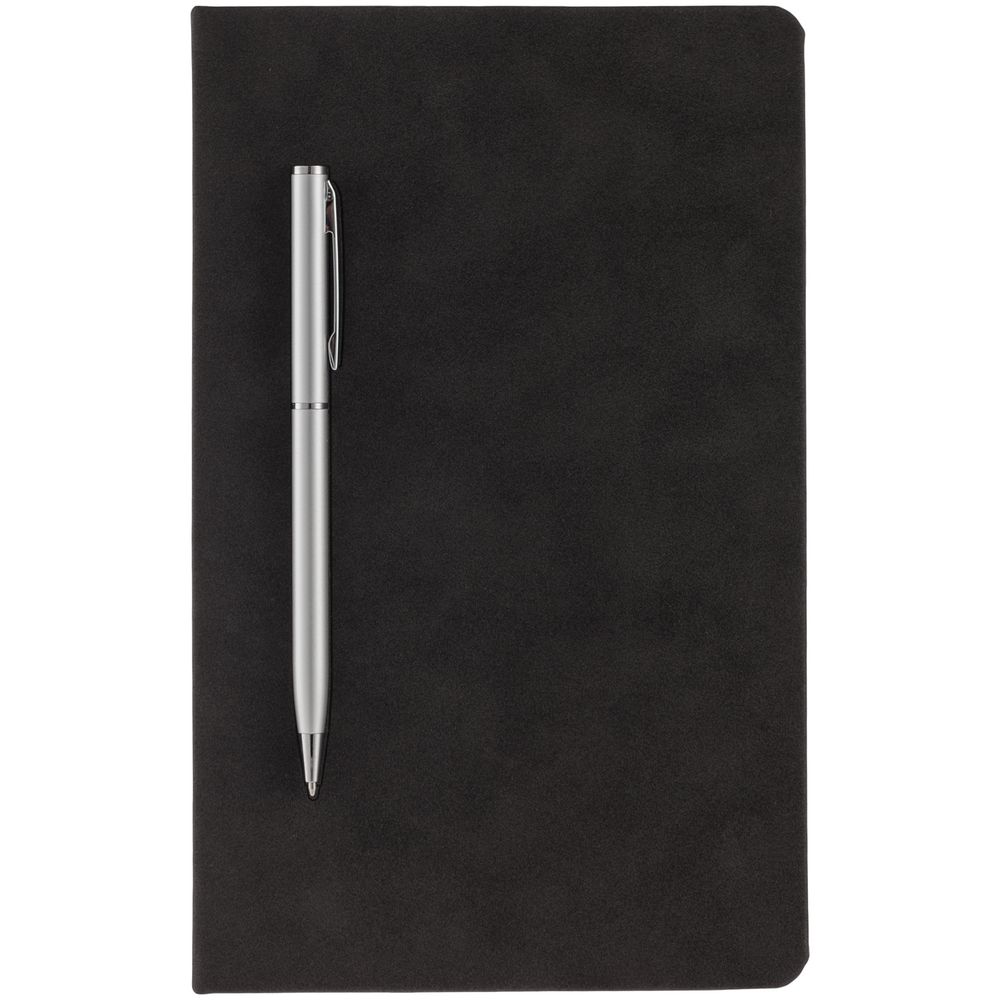 Блокнот в твердой обложке, выполненной из материала Nubuck, черный, дополнен цветным ляссе и магнитом, удерживающим ручку.