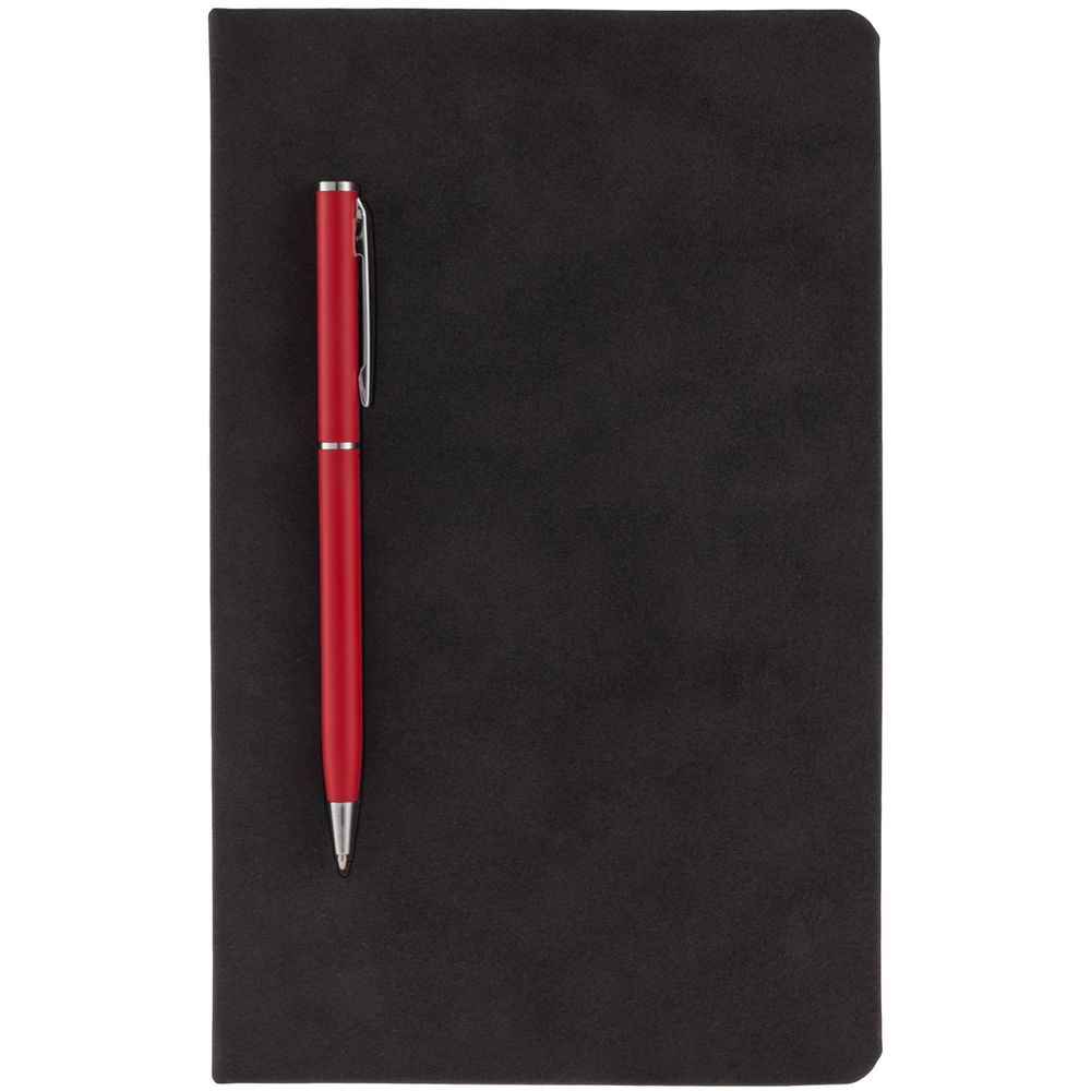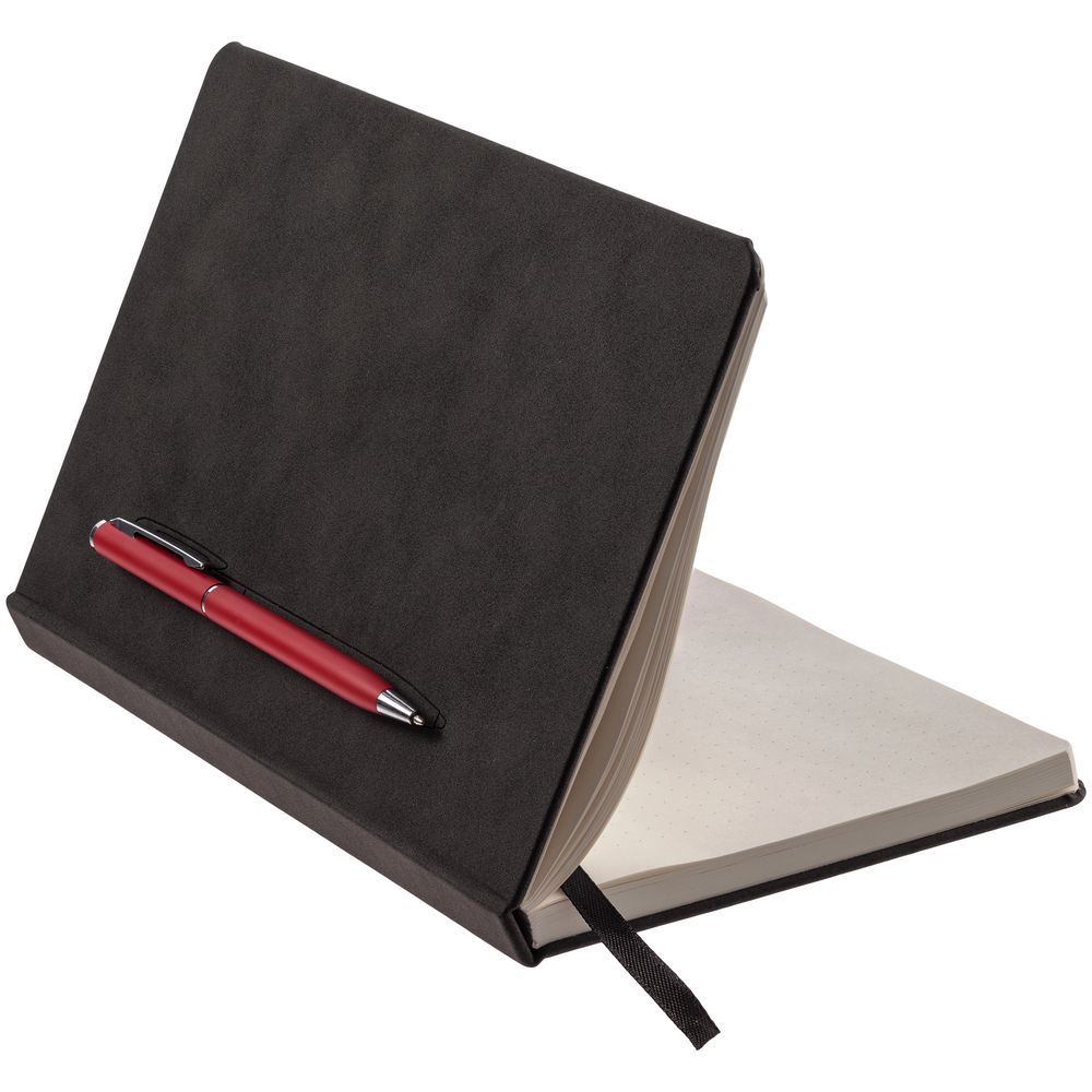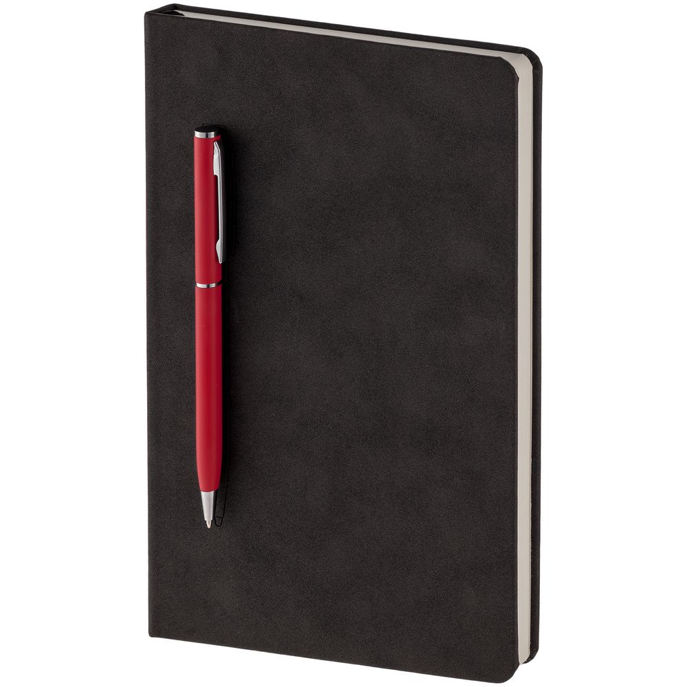 Блокнот в твердой обложке, выполненной из материала Nubuck, черный, дополнен цветным ляссе и магнитом, удерживающим ручку.