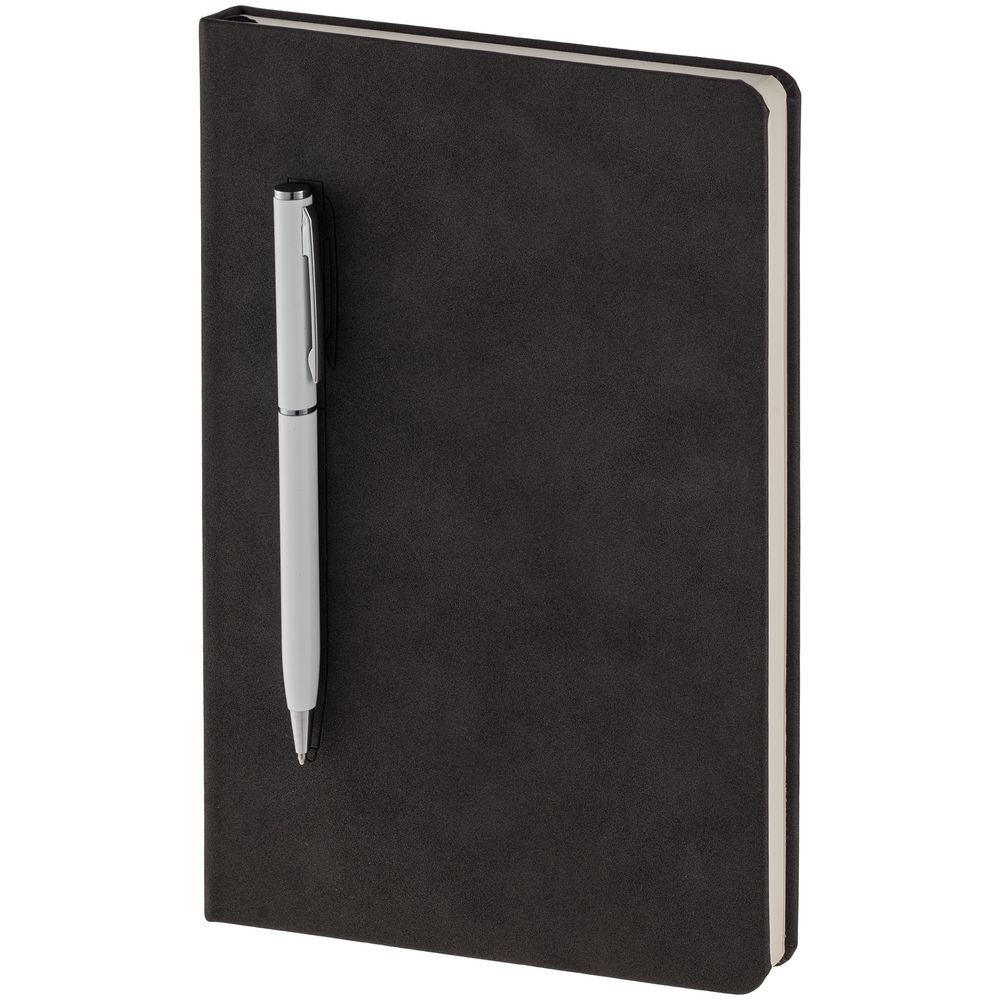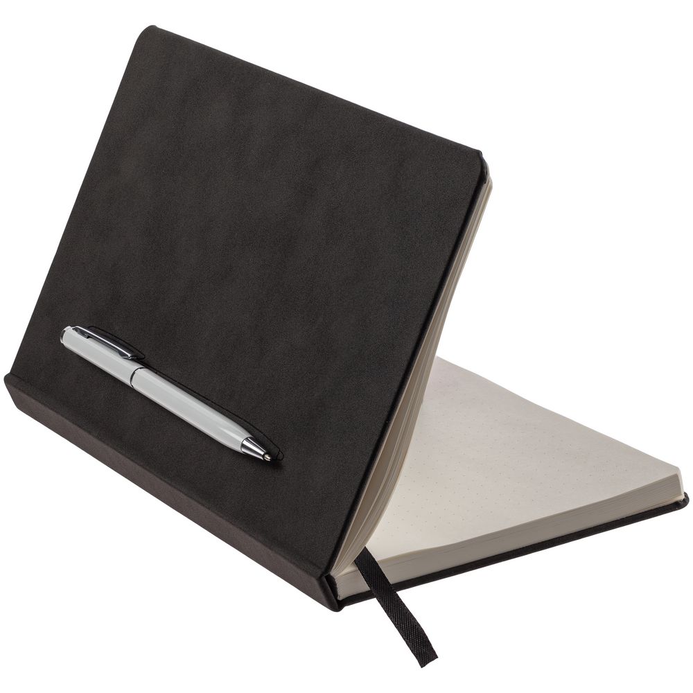 Блокнот в твердой обложке, выполненной из материала Nubuck, черный, дополнен цветным ляссе и магнитом, удерживающим ручку.