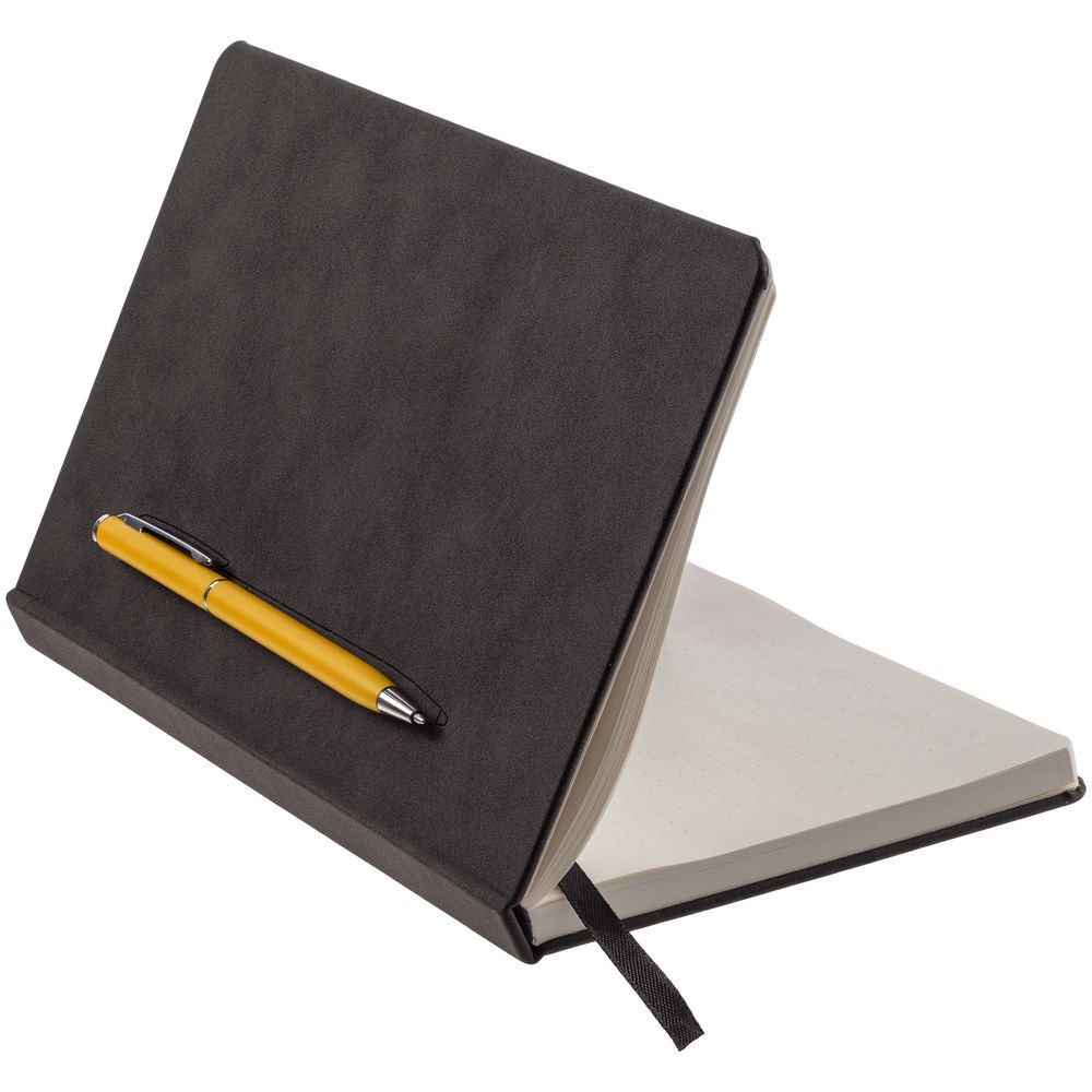 Блокнот в твердой обложке, выполненной из материала Nubuck, черный, дополнен цветным ляссе и магнитом, удерживающим ручку.
