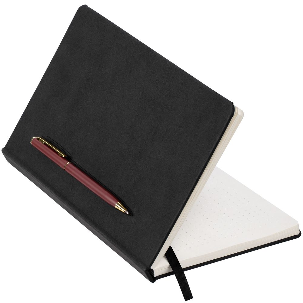 Блокнот в твердой обложке, выполненной из материала Nubuck, черный, дополнен цветным ляссе и магнитом, удерживающим ручку.
