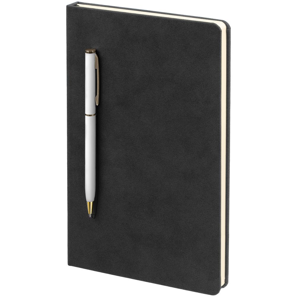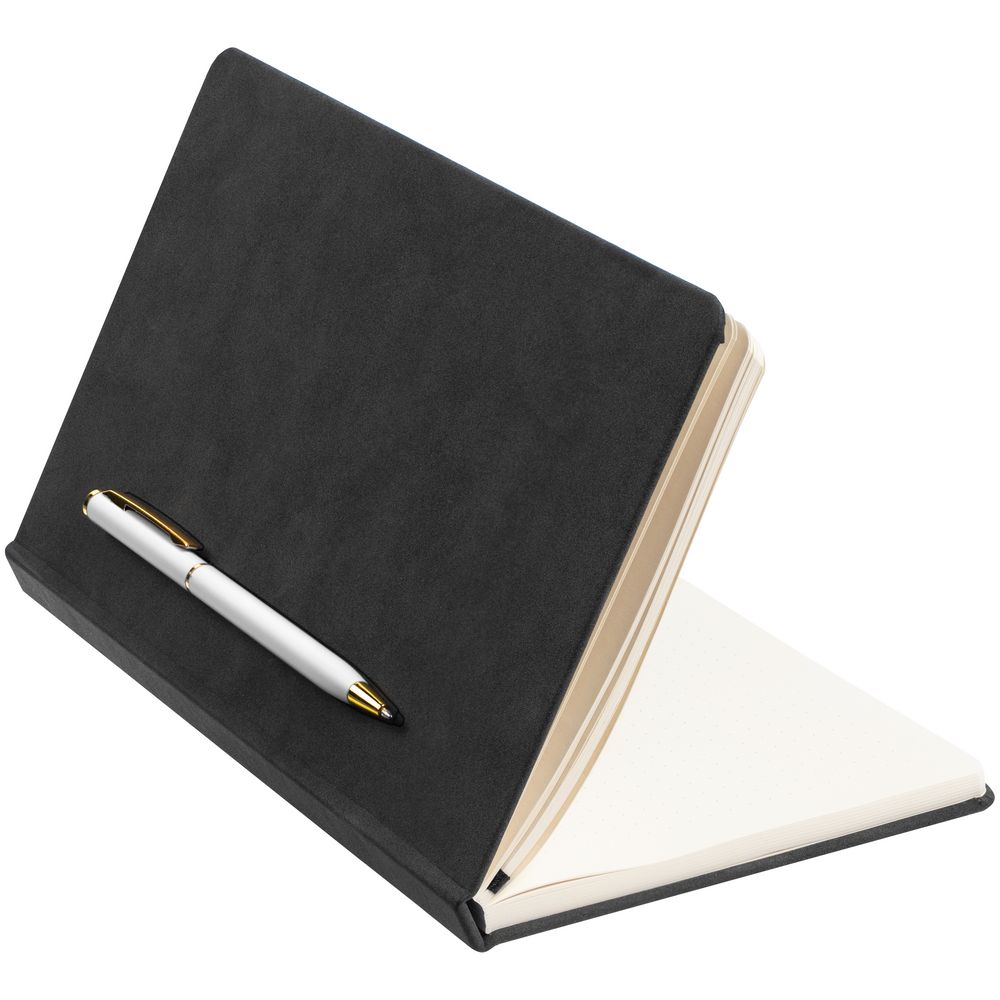 Блокнот в твердой обложке, выполненной из материала Nubuck, черный, дополнен цветным ляссе и магнитом, удерживающим ручку.