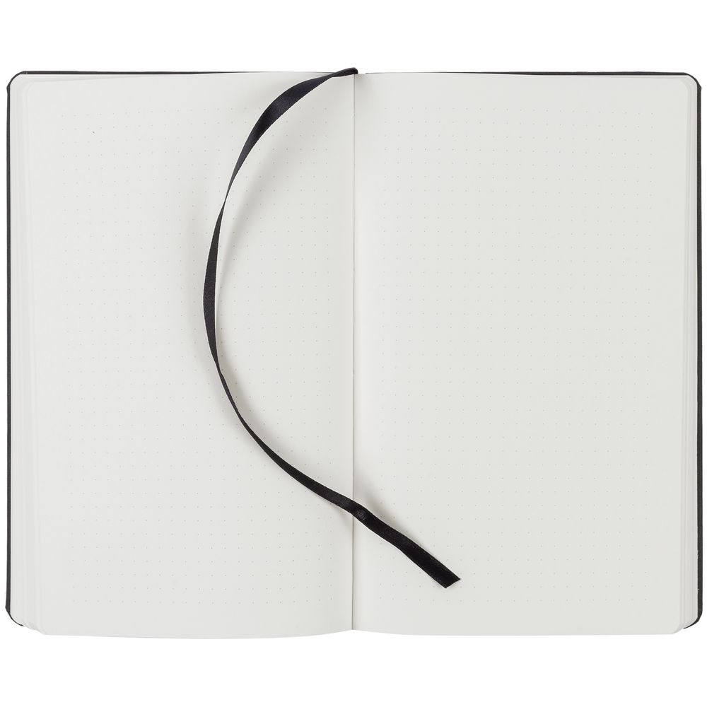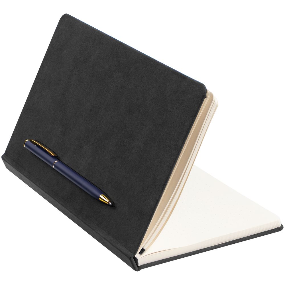 Блокнот в твердой обложке, выполненной из материала Nubuck, черный, дополнен цветным ляссе и магнитом, удерживающим ручку.