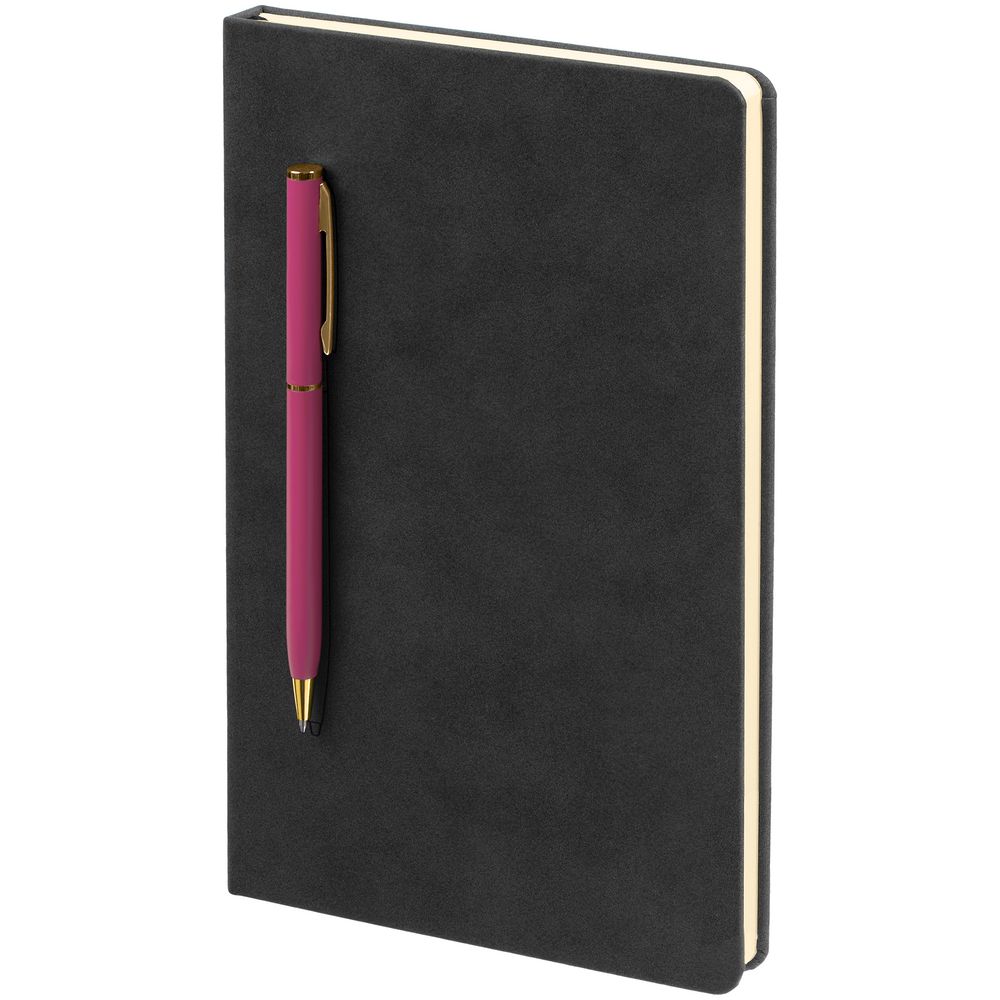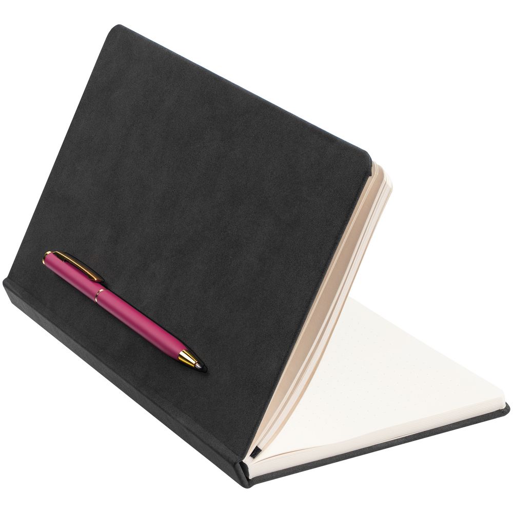 Блокнот в твердой обложке, выполненной из материала Nubuck, черный, дополнен цветным ляссе и магнитом, удерживающим ручку.