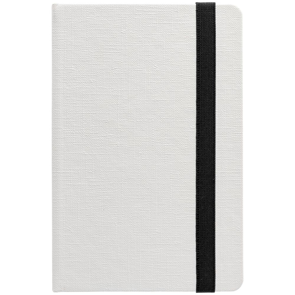 Блокнот с твердой обложкой, выполнен из материала Tex, белый. Дополнен цветной резинкой и ляссе.