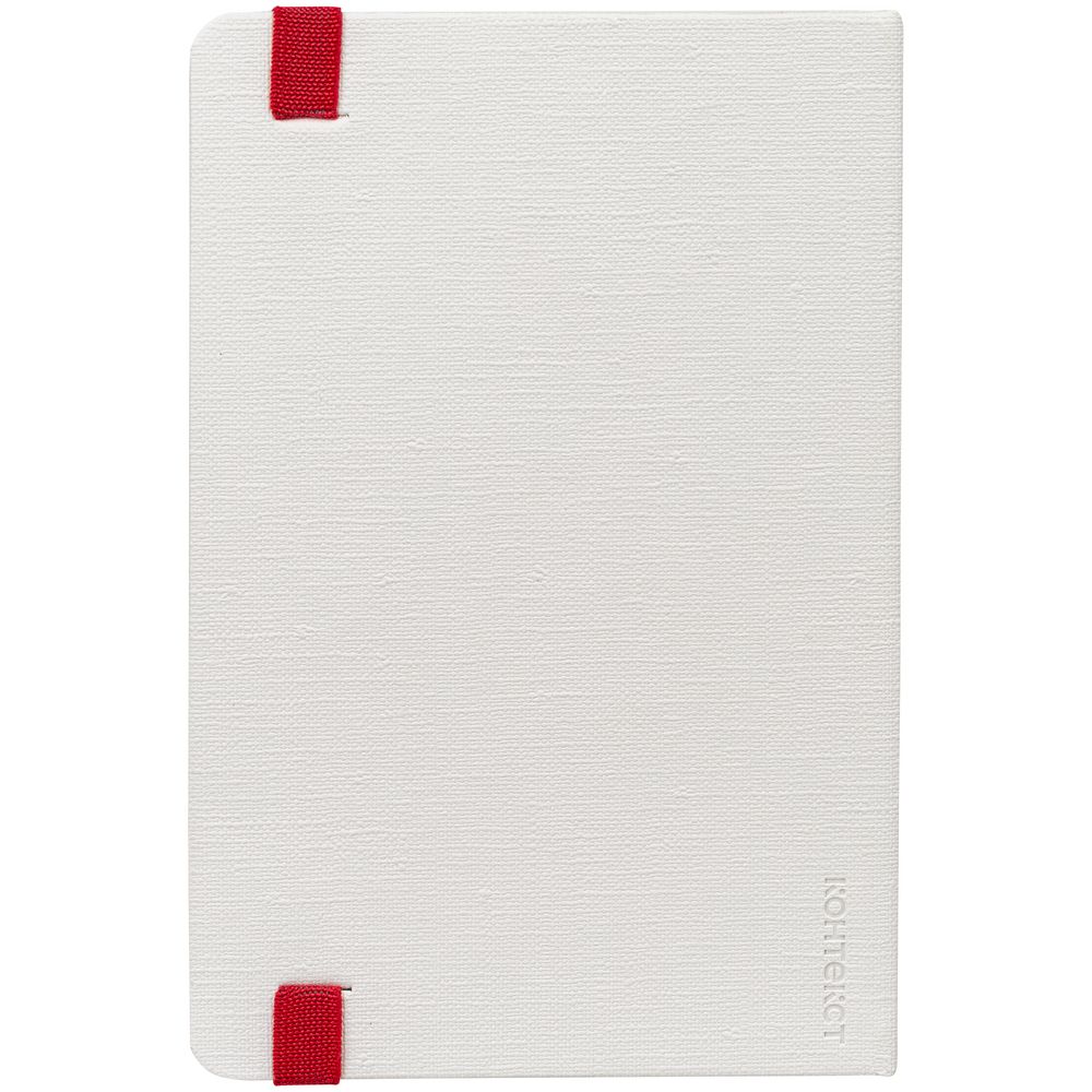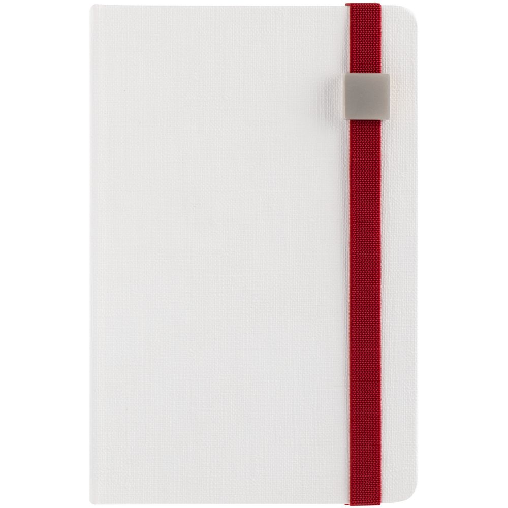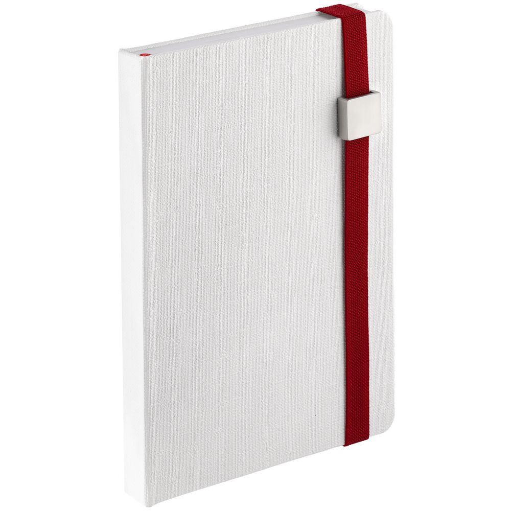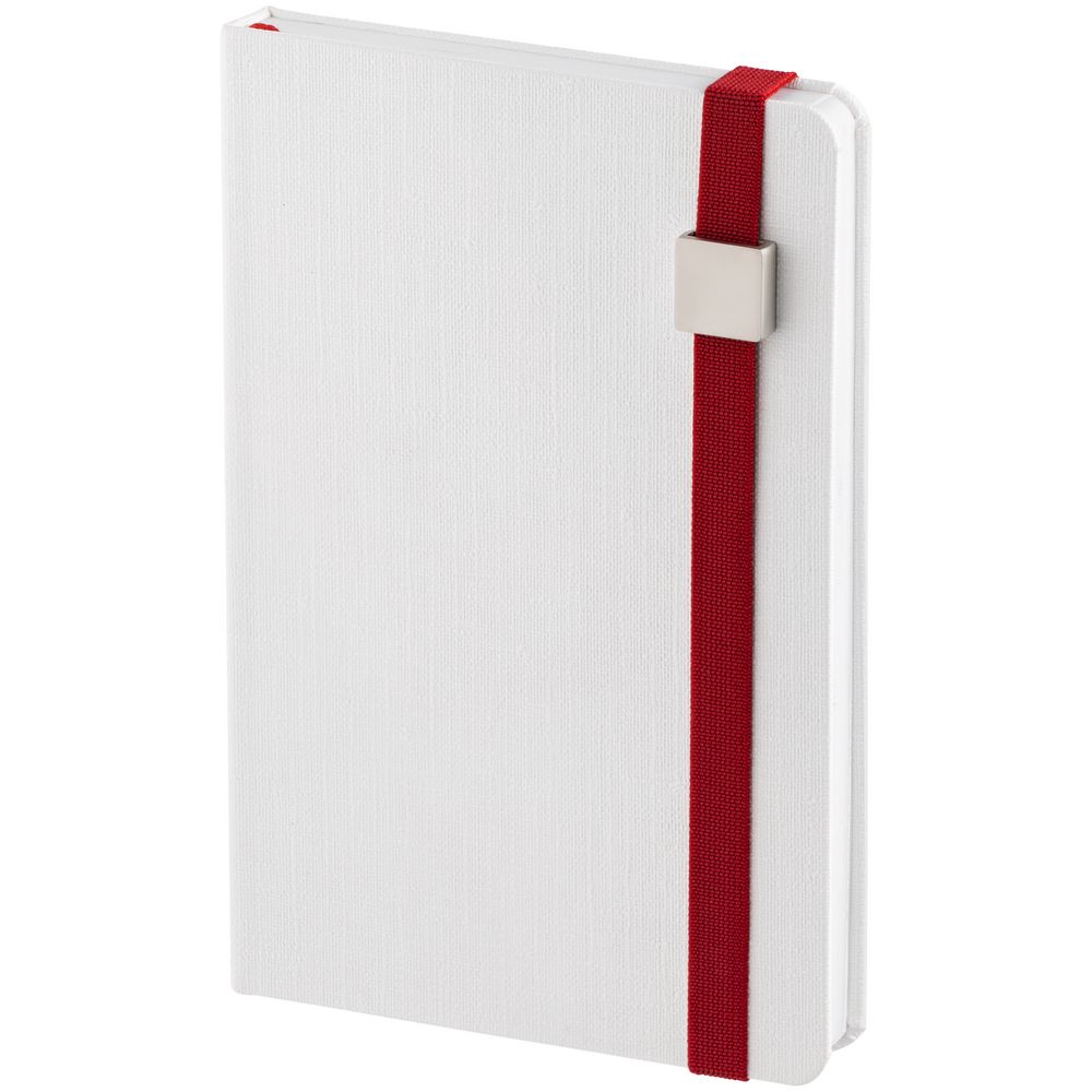 Блокнот с твердой обложкой, выполнен из материала Tex, белый. Дополнен цветной резинкой с металлическим шильдом и ляссе.