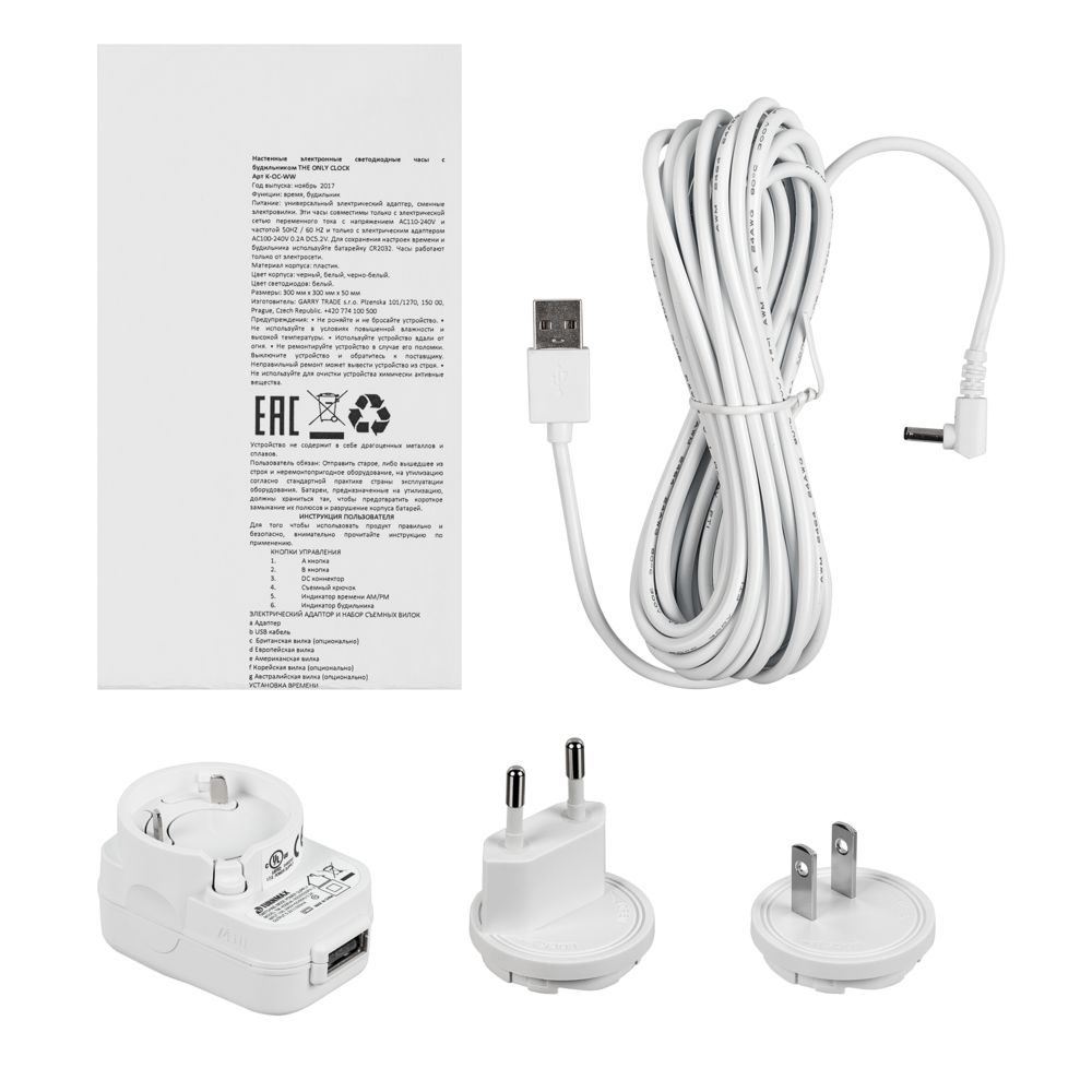 Питание от электросети переменного тока через универсальный электрический адаптер со сменными вилками (входит в комплект). Для сохранения настроек времени и будильника используйте батарейку CR2032. Батарейка в комплект не входит.