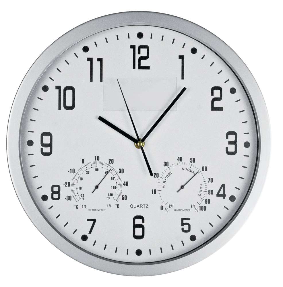 Классические настенные часы с термометром и гигрометром. В верхней части циферблата находится планка для нанесения логотипа, которая легко извлекается с тыльной стороны корпуса.