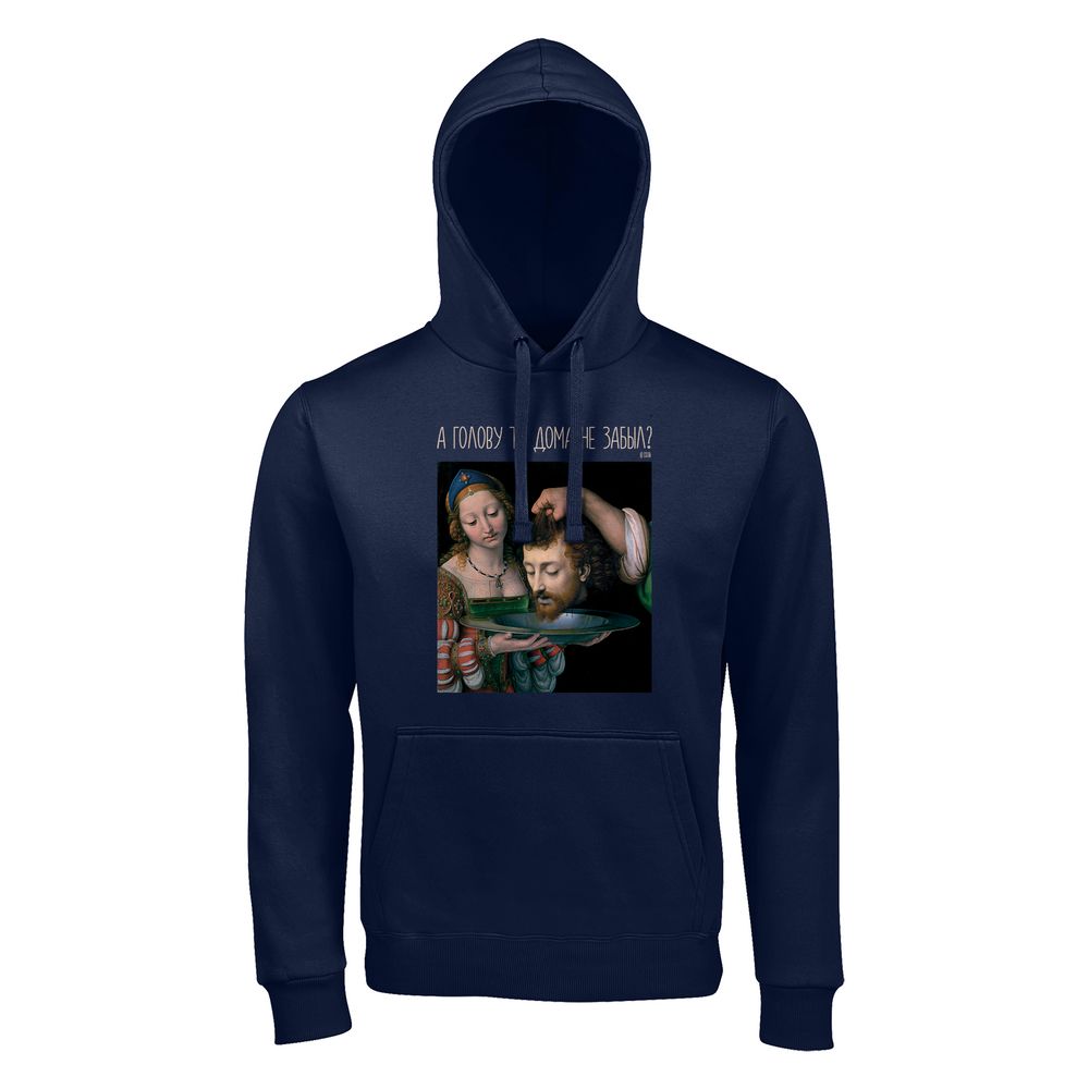 Худи с ярким напоминанием не забыть, выходя на улицу, что-нибудь важное! Сюжет эпохи Ренессанса о прихоти Саломеи иллюстрирует известную присказку: самое главное, что человек может забыть — это его голова. Забытый телефон, кошелек, ключи — мелочь, по сравнению с оставленной дома мыслящей частью тела.