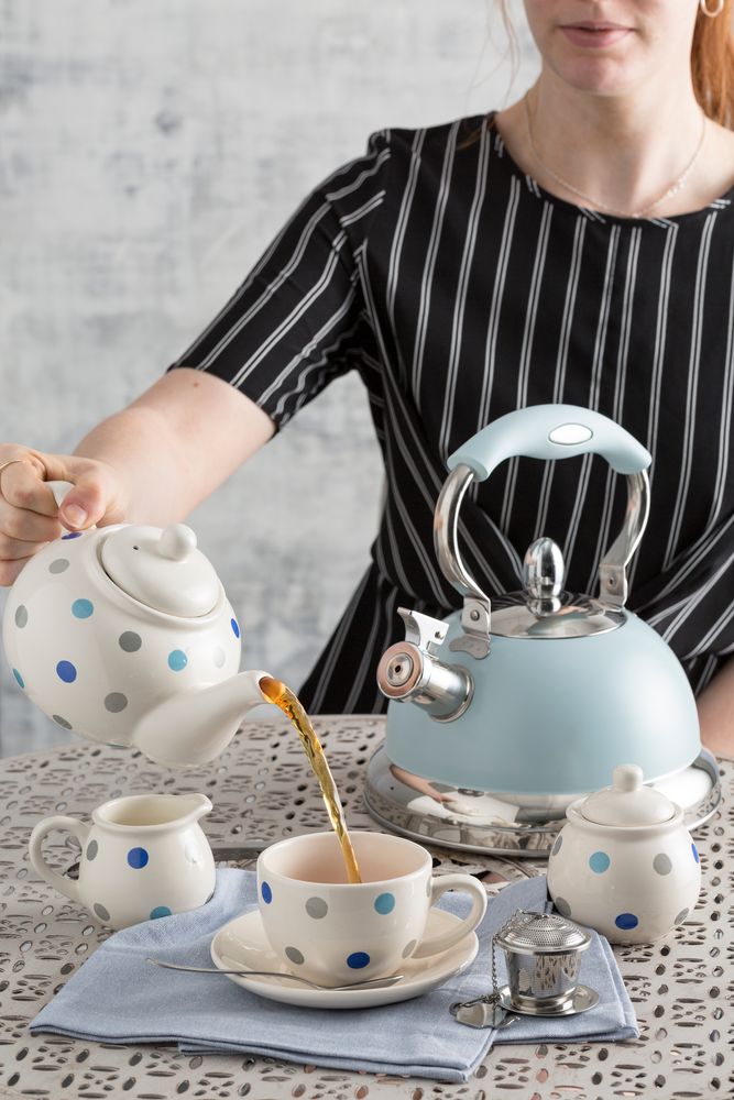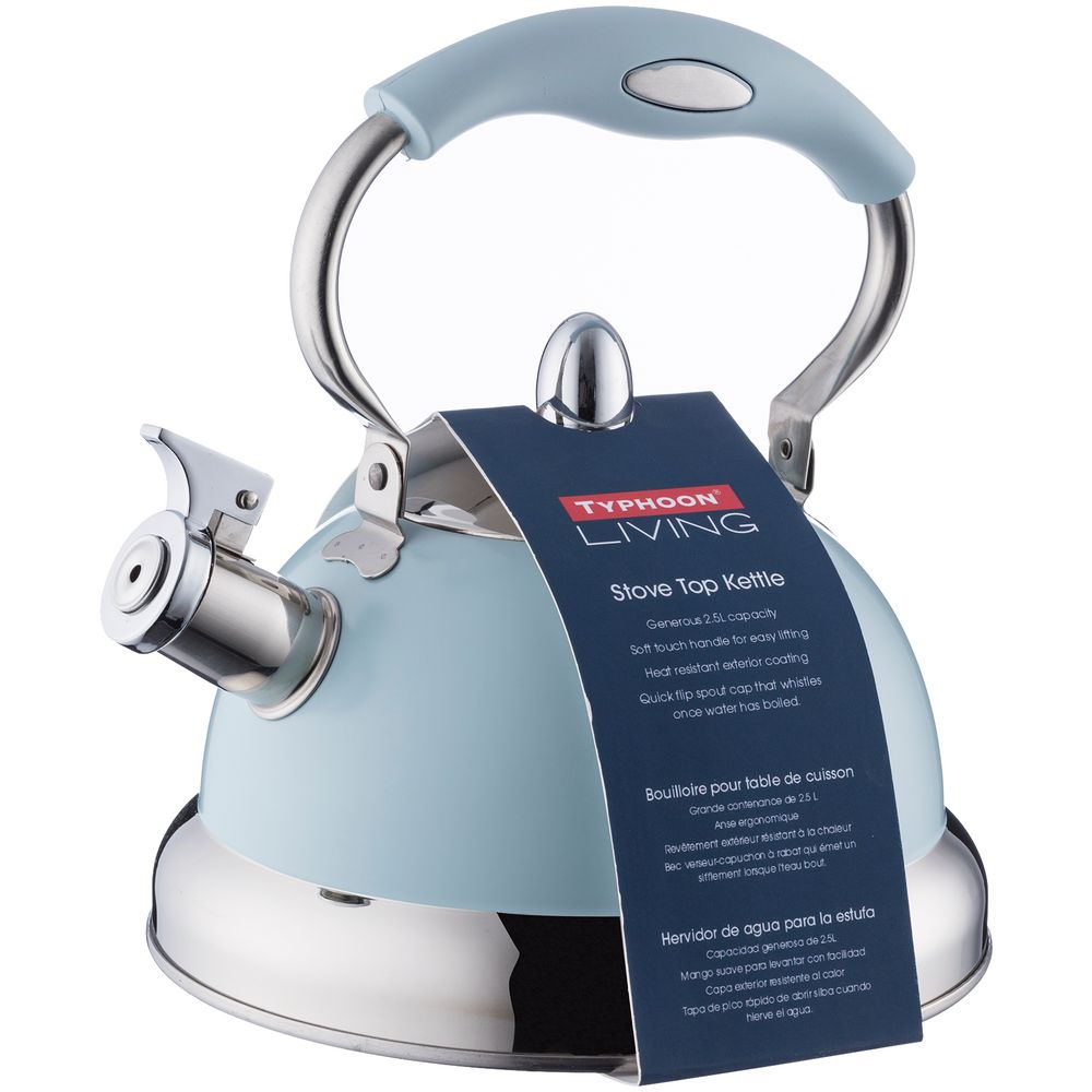 Чайник из нержавеющей стали с термостойким покрытием. Свисток просигнализирует о закипании воды.
