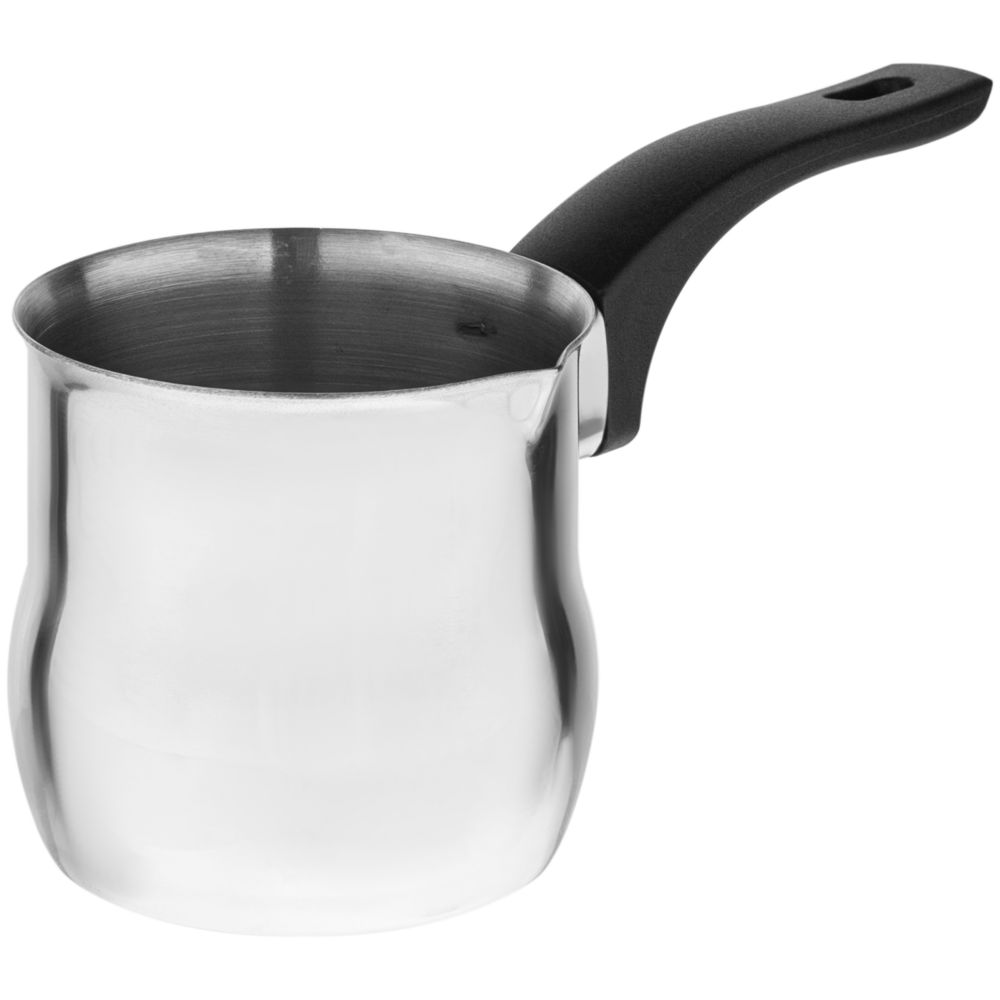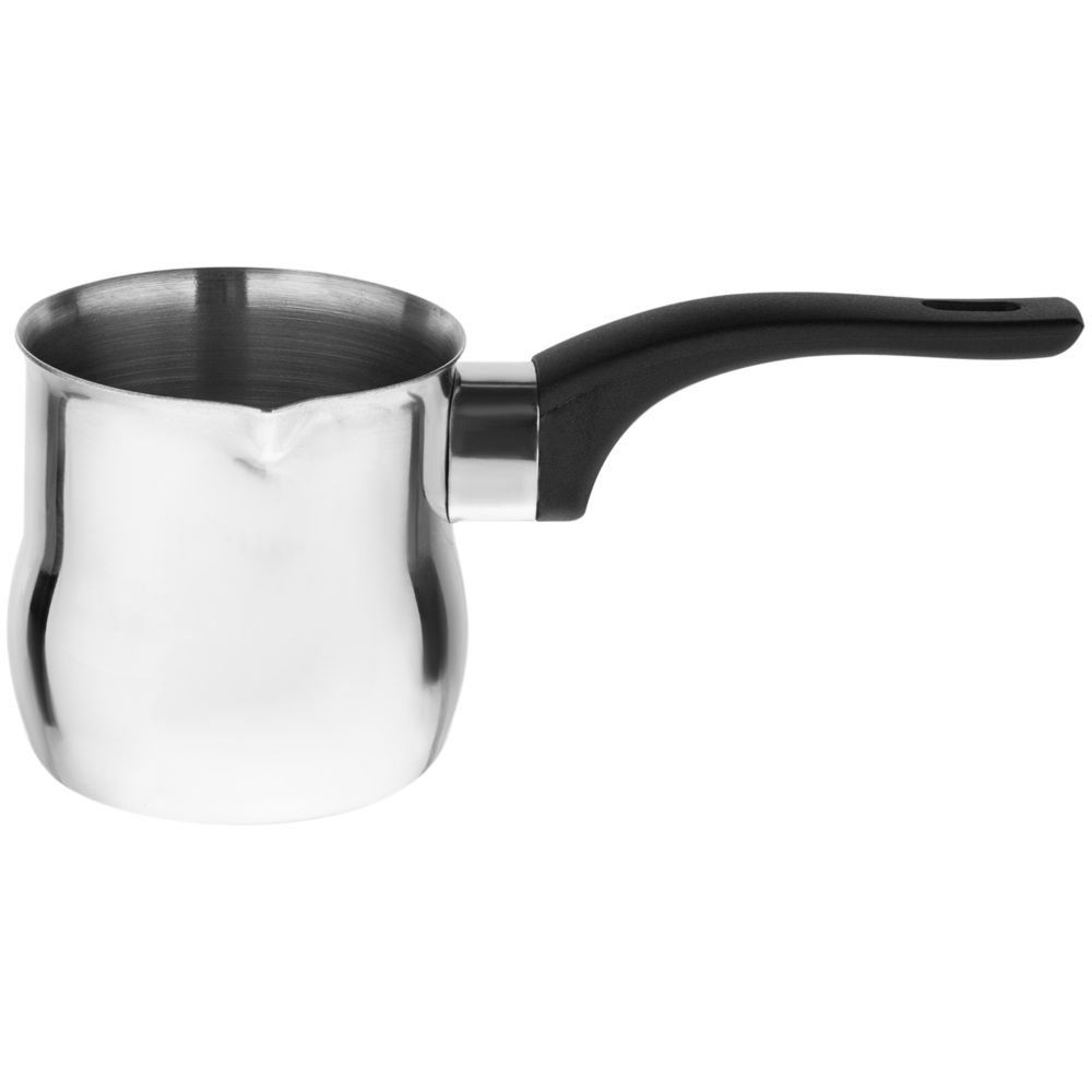 Обожаете начинать свой день с чашечки свежесваренного кофе? Для этого не обязательно обзаводиться кофеваркой. Турка Kaffi легко справится с этой задачей. Турка сделана из высококачественной нержавеющей стали, которая не подвержена коррозии, не боится высоких температур и проста в уходе. Ручка турки выполнена из бакелита, благодаря чему не нагревается и не скользит в руке.Емкость 250 мл.