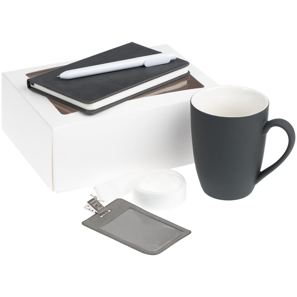 Лаконичный приветственный набор Hop In содержит все самое необходимое для успешной и быстрой адаптации нового сотрудника в команде. Это основные офисные принадлежности — блокнот и ручка — для подробной записи идей и планов; чехол для пропуска на ленте — для безопасности и идентификации; компактная кружка — для приятного перерыва в компании с новыми коллегами.