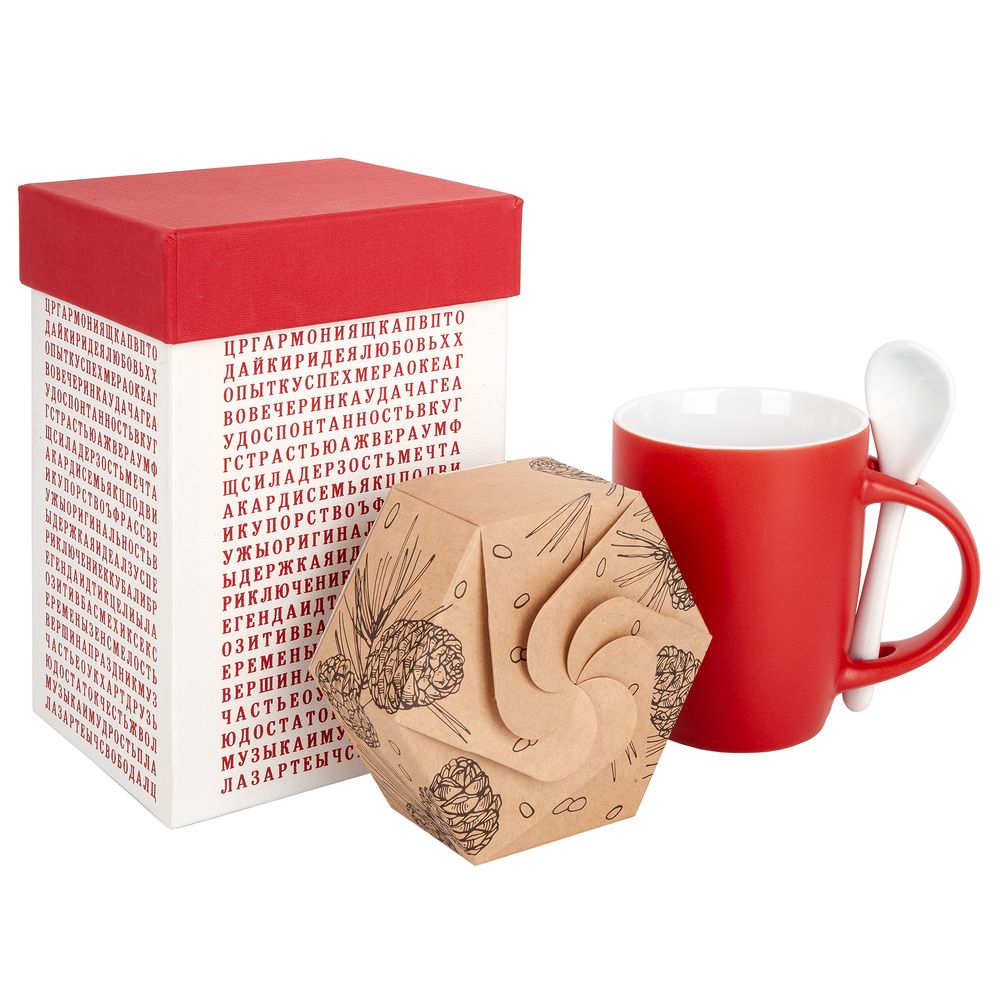 В комплект входят фарфоровая кружка Cheer Up с ложкой и конфеты «Кедровый грильяж» с клюквой.