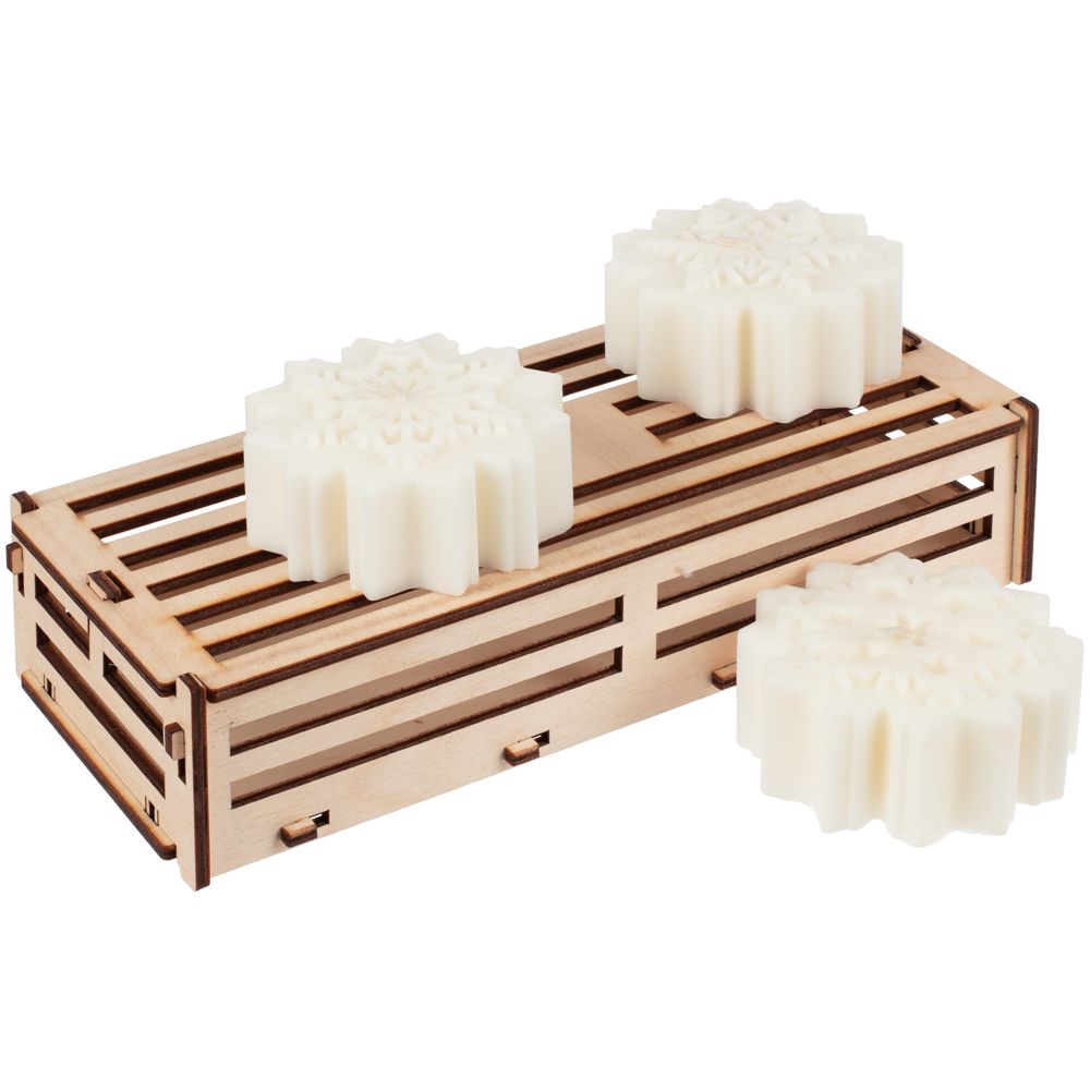 Набор из трех свечей в фанерном ящичке. Каждая снежинка в наборе представлена в своем неповторимом узоре.Набор из 3 свечей в ящике. Каждая снежинка упакована в отдельный полиэтиленовый пакет.