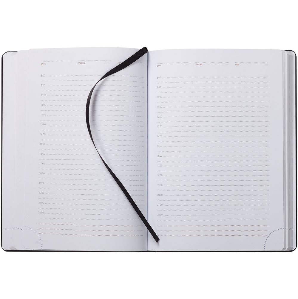 Ежедневник с твердой обложкой, выполнен из материала Winner, черный АА, дополнен ляссе в цвет обложки.