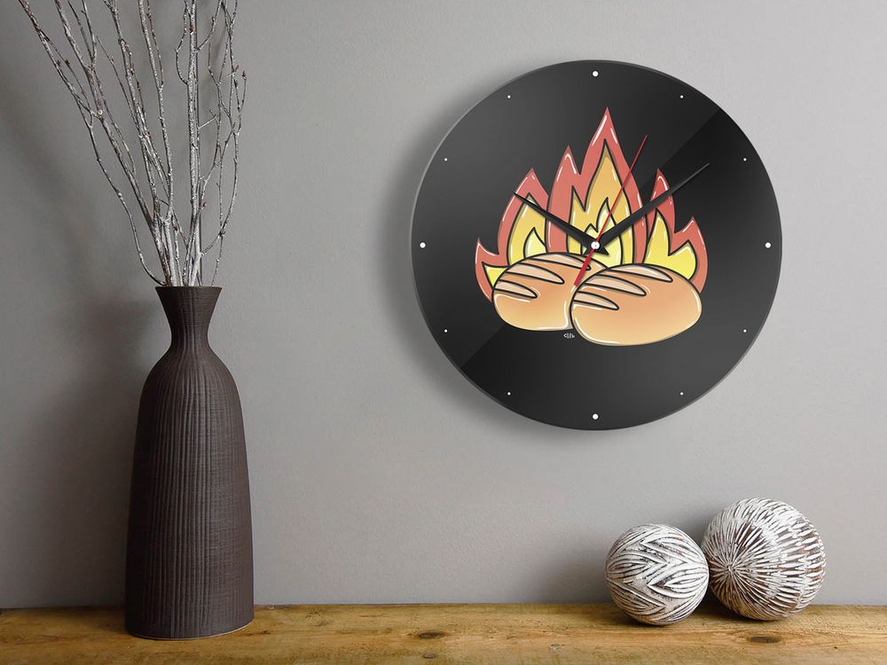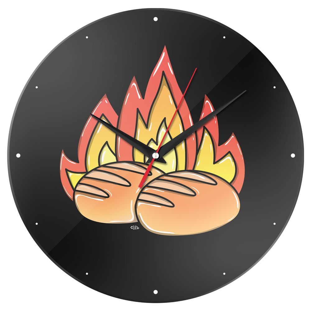 Коллекция «Булки горят» посвящается самым безмятежным, умеющим прятать легкое волнение за спокойной улыбкой! Предметы берут на себя роль громоотвода, а вам остается только наслаждаться приятным времяпрепровождением на любимом рабочем месте!Часовая и минутная стрелки — черного цвета, секундная — красного цвета.