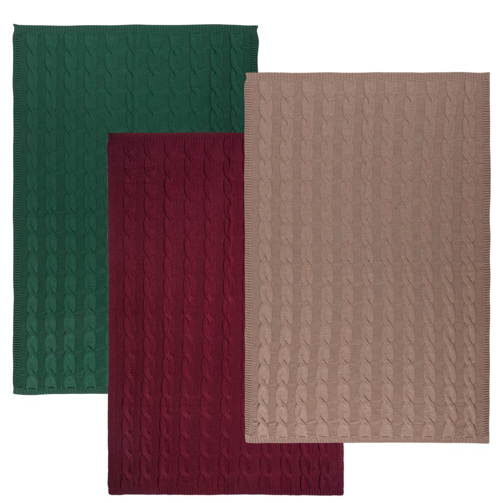 Модель: однотонный плед с фактурной вязкой, которая позволяет сделать его воздушным и объемным. Чередуя различные типы петель на гладком полотне, можно вывязать любую графику — логотип, текст, товарный знак.