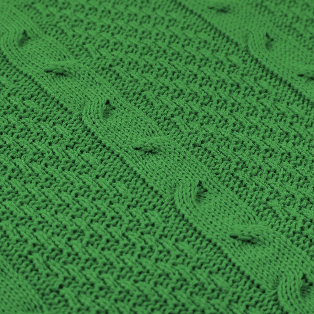 Модель: однотонный плед с фактурной вязкой, которая позволяет сделать его воздушным и объемным. Чередуя различные типы петель на гладком полотне, можно вывязать любую графику — логотип, текст, товарный знак.