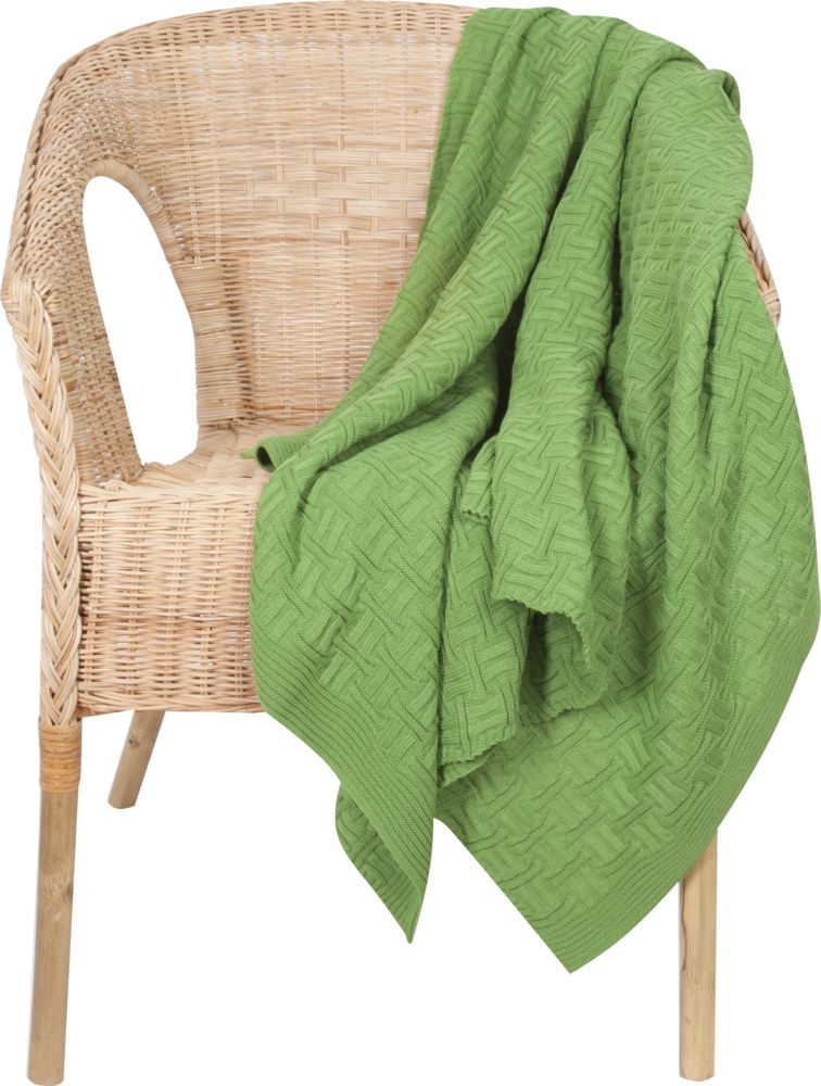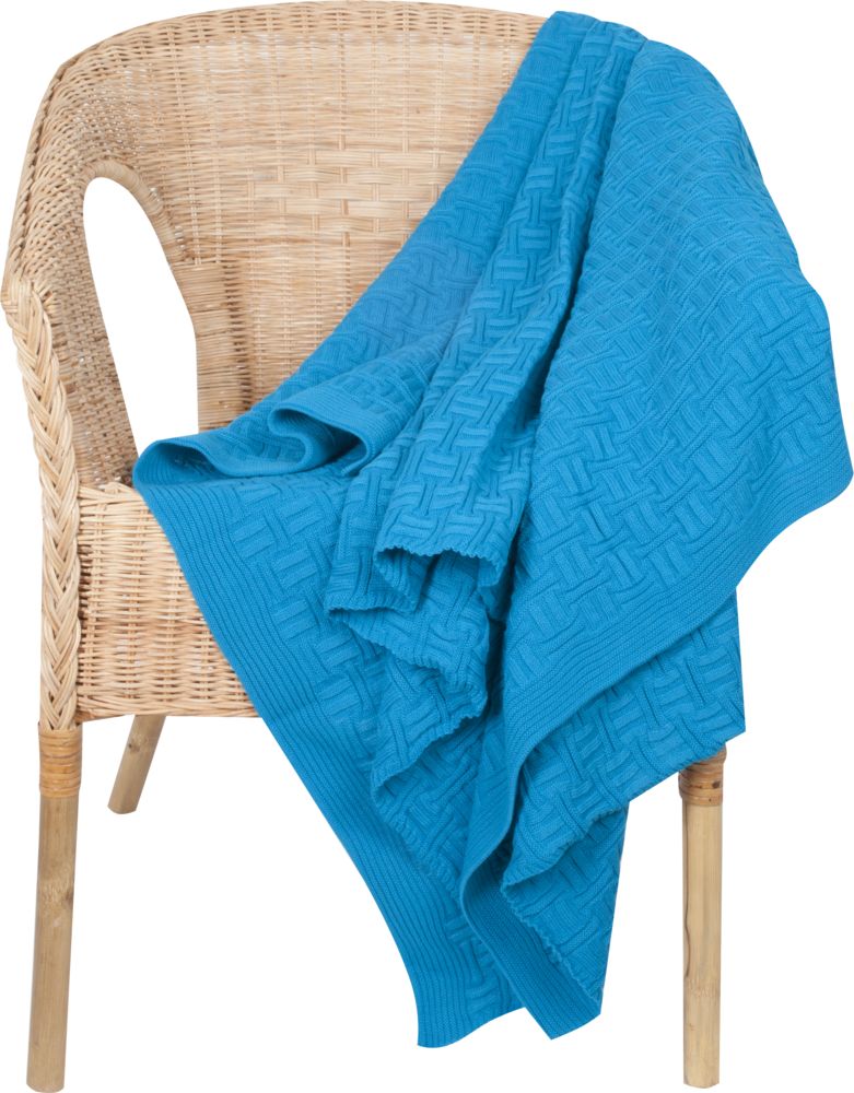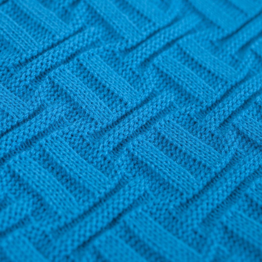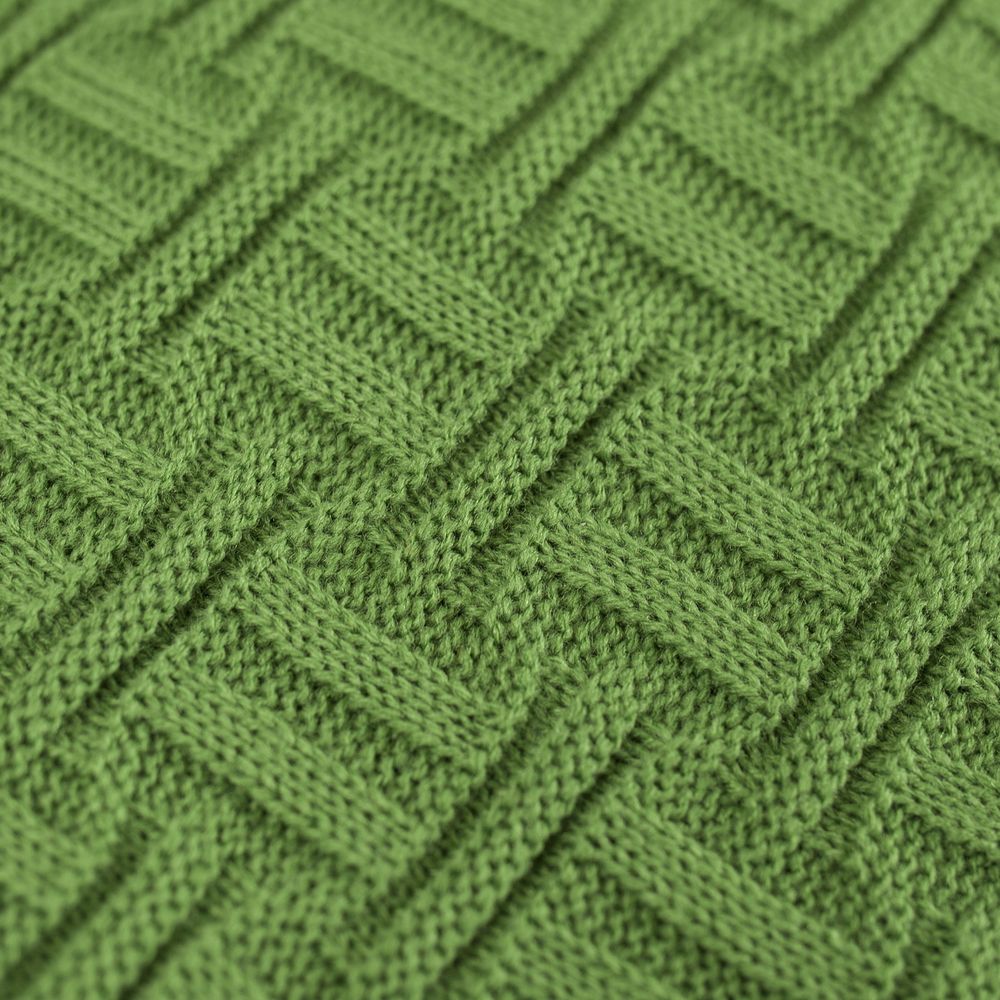 Модель: однотонный плед с фактурной вязкой, которая позволяет сделать его воздушным и объемным. Чередуя различные типы петель на гладком полотне, можно вывязать любую графику — логотип, текст, товарный знак.
