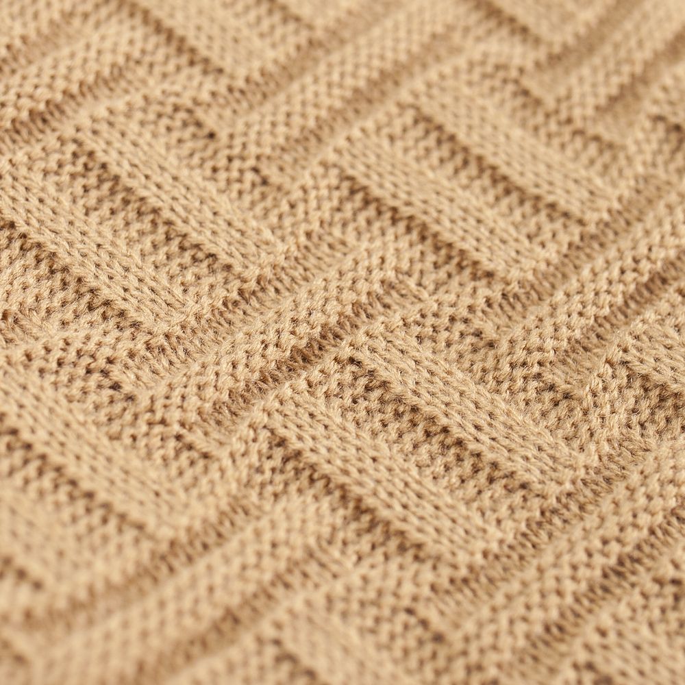 Модель: однотонный плед с фактурной вязкой, которая позволяет сделать его воздушным и объемным. Чередуя различные типы петель на гладком полотне, можно вывязать любую графику — логотип, текст, товарный знак.