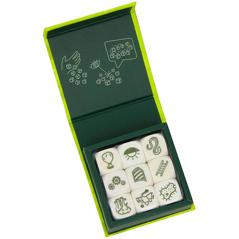 Все просто: вы бросаете кубики и рассказываете историю, в которой хитрым образом переплетается все, что выпало на 9 выпавших гранях. А параллельно развиваете память, фантазию и творческое мышление, учитесь видеть различные варианты сюжета и оттачиваете мастерство оратора.