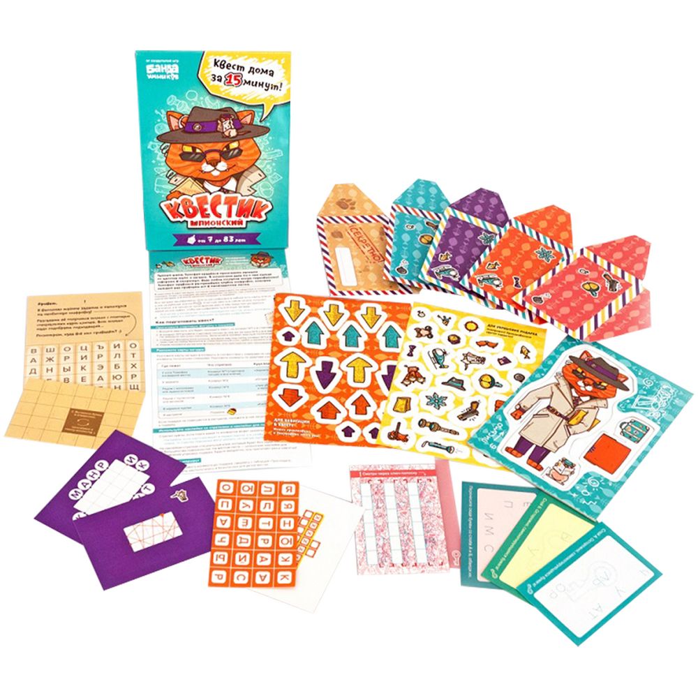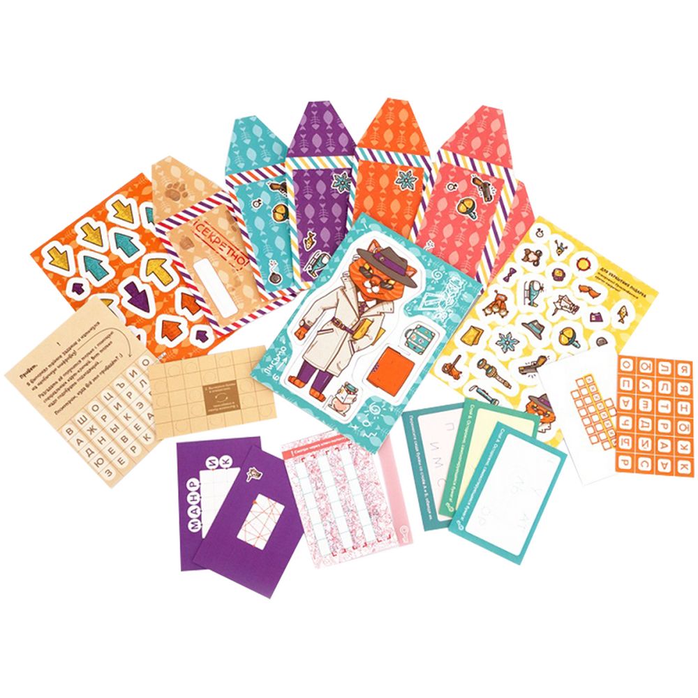 - В комплекте: 5 карт-загадок, 5 конвертов, карты-ключи, стартовое письмо, фигурка кота-шпиона, вспомогательные наклейки, инструкция по подготовке и проведению квеста
