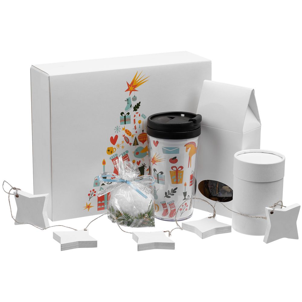 Набор упакован в подарочную белую коробку с принтом и новогодним шубером.