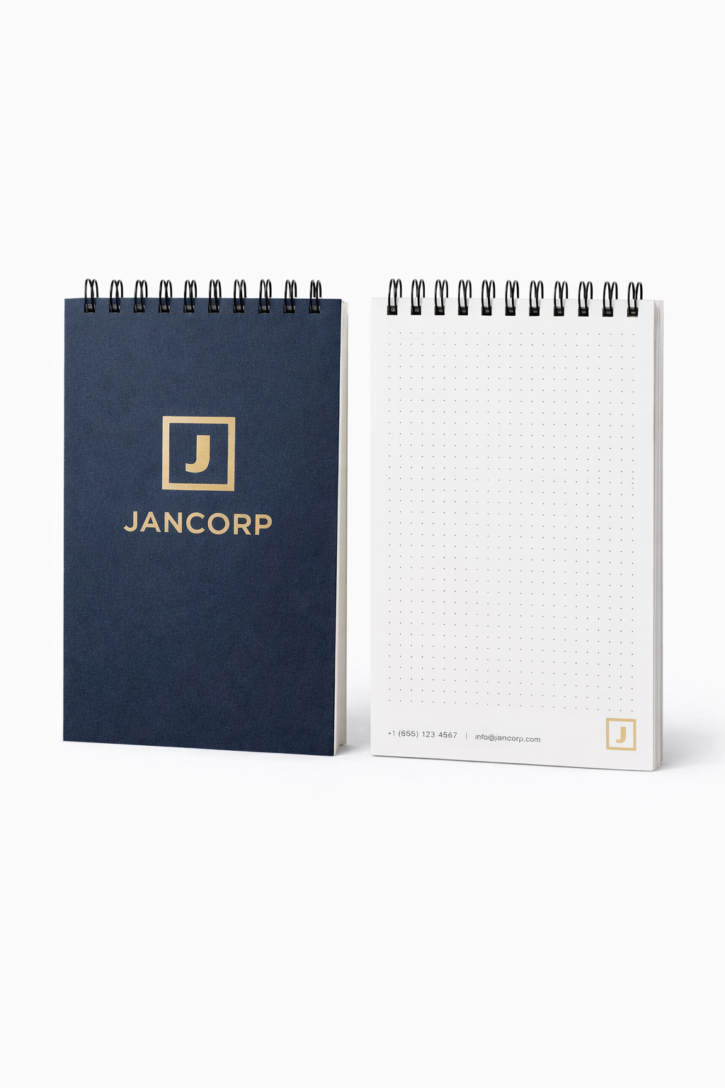 Мы изготавливаем брендированные блокноты формата A5 на верхней пружине с разными видами печати и отделки — от аккуратных корпоративных до премиальных решений.