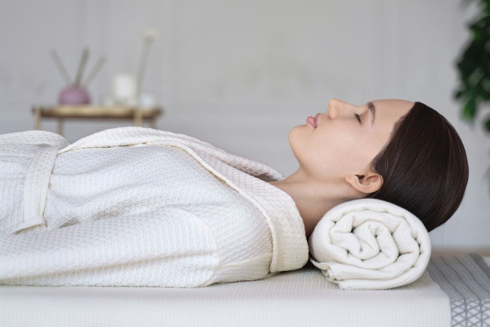 Двустороннее полотенце: с одной стороны фактурное плетение, напоминающее вафельное, с другой — привычные петли махровой ткани.